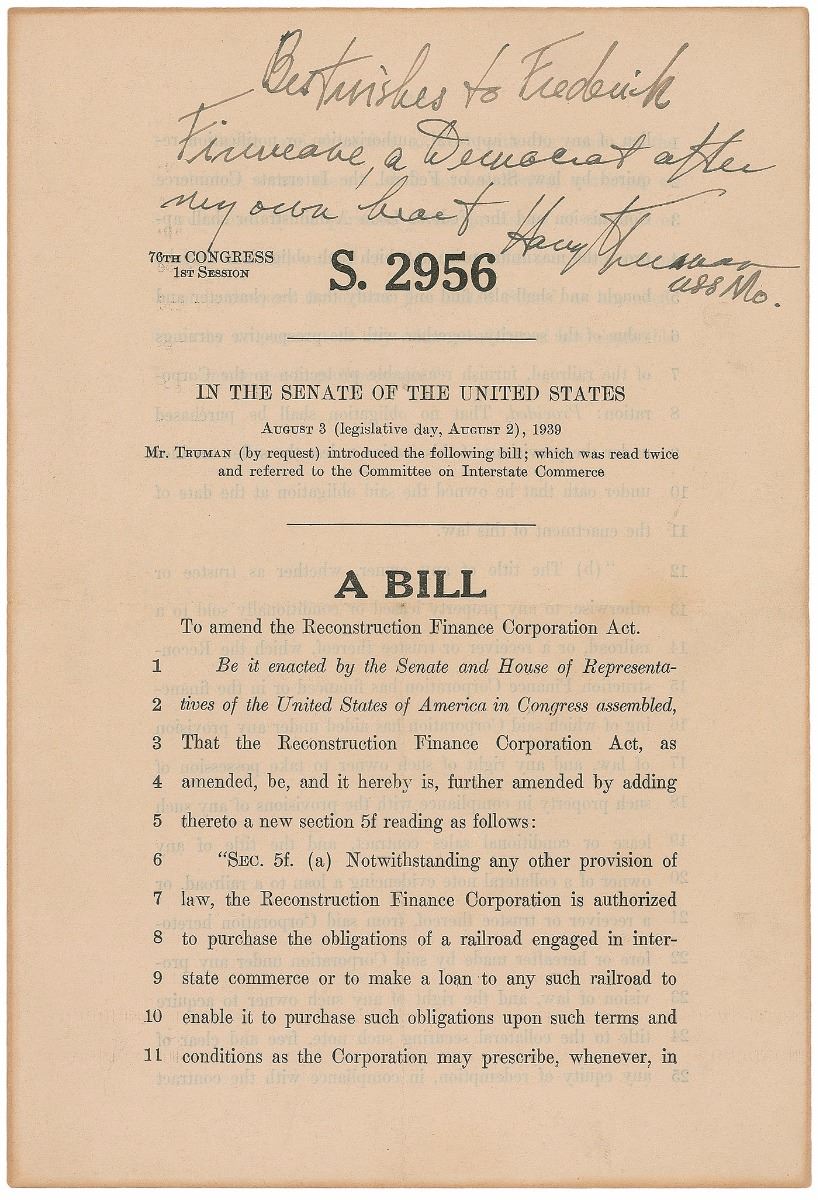 Printed Senate bill entitled ‘A Bill to amend the Reconstruction Finance Corporation Act,’ three pages on two adjoining sheets, 7.5 x 11, August 3, 1939, signed and inscribed at the top in fountain pen, “Best wishes to Frederick Firweave, a Democrat after my own heart, Harry S. Truman, USS Mo.” Central vertical and horizontal folds, scattered creases, and toning to edges, otherwise fine condition.