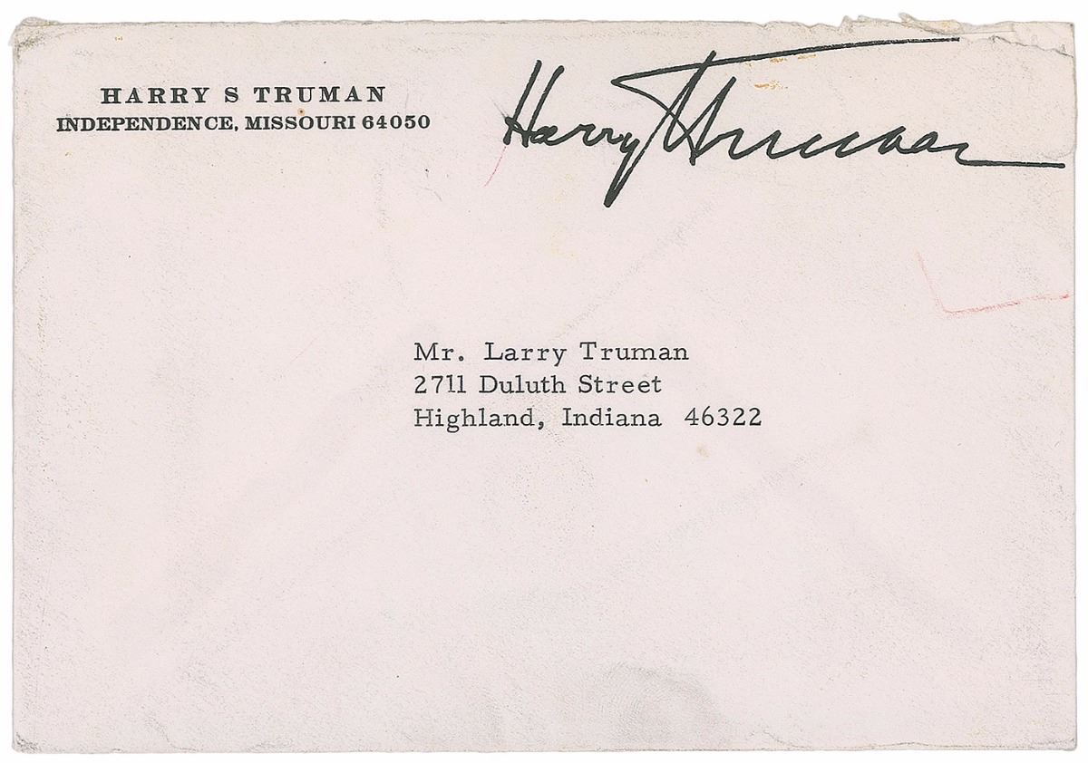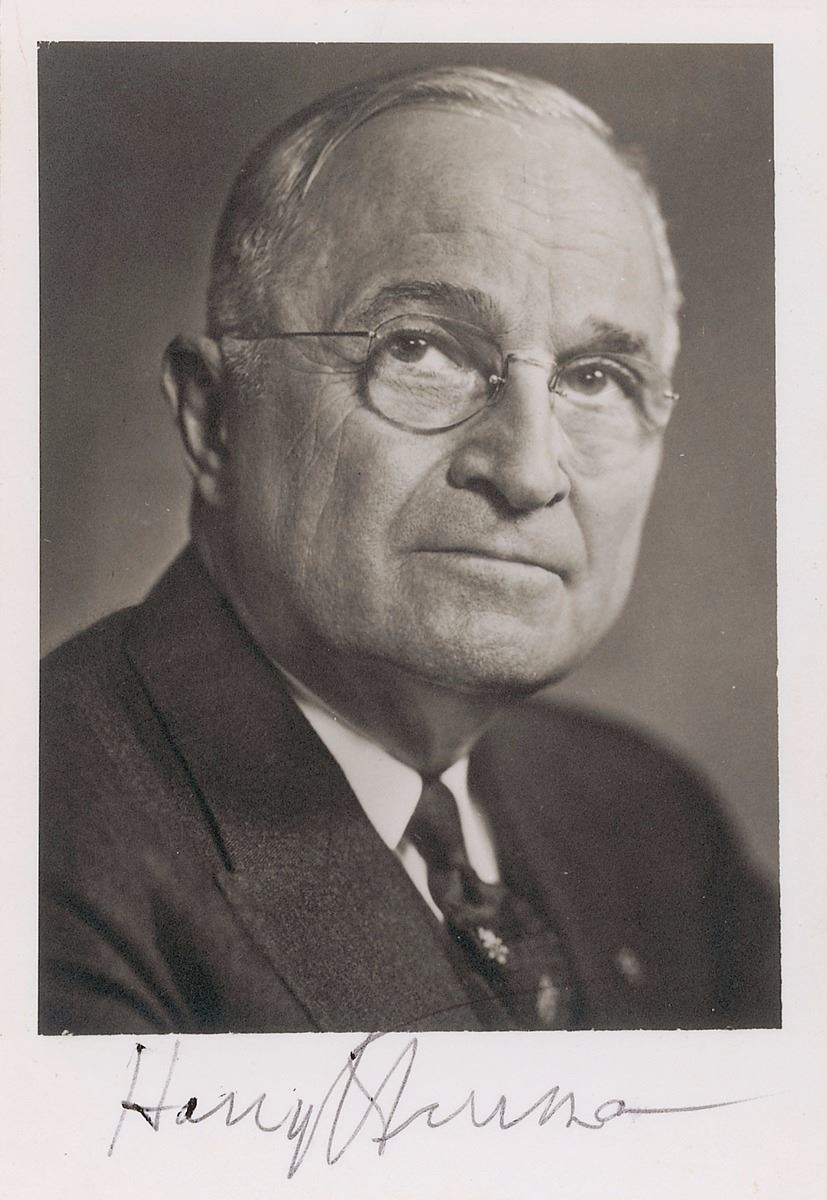 Matte-finish 3.5 x 5 head-and-shoulders photo of Truman, signed in the lower border in black ballpoint. In fine condition. Accompanied by the original mailing envelope bearing a pre-printed free frank.