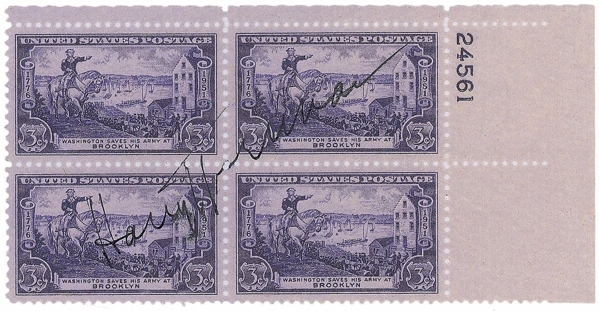 Block of four purple three-cent postage stamps honoring George Washington saving his army at Brooklyn, 4 x 2, signed diagonally in fountain pen. In fine condition, with some light contrast to signature against the dark background.