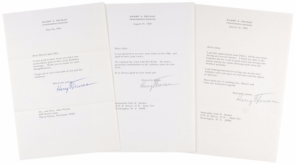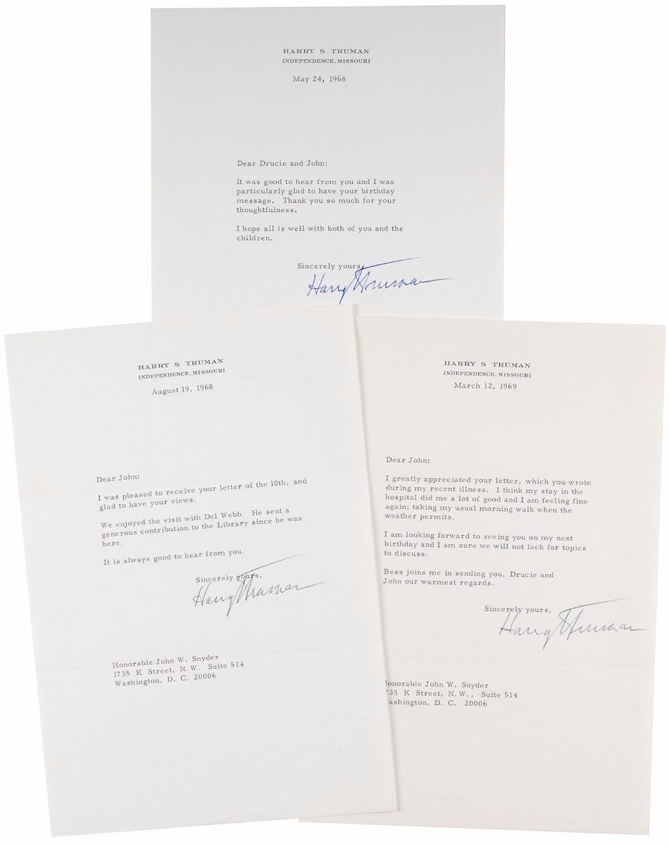 Set of three TLSs, each one page, 7.25 x 10.5, personal letterhead, dated between 1968 and 1969. Two are to former Secretary of the Treasury John W. Snyder, one in part: “I greatly appreciated your letter, which you wrote during my recent illness. I think my stay in the hospital did me a lot of good and I am feeling fine again; taking my usual morning walk when the weather permits.” The other, in part: “We enjoyed the visit with Del Webb. He sent a generous contribution to the Library since he was here.” The third is to Snyder’s daughter Drucie and her husband John Horton, sending thanks for birthday wishes. In overall fine condition.