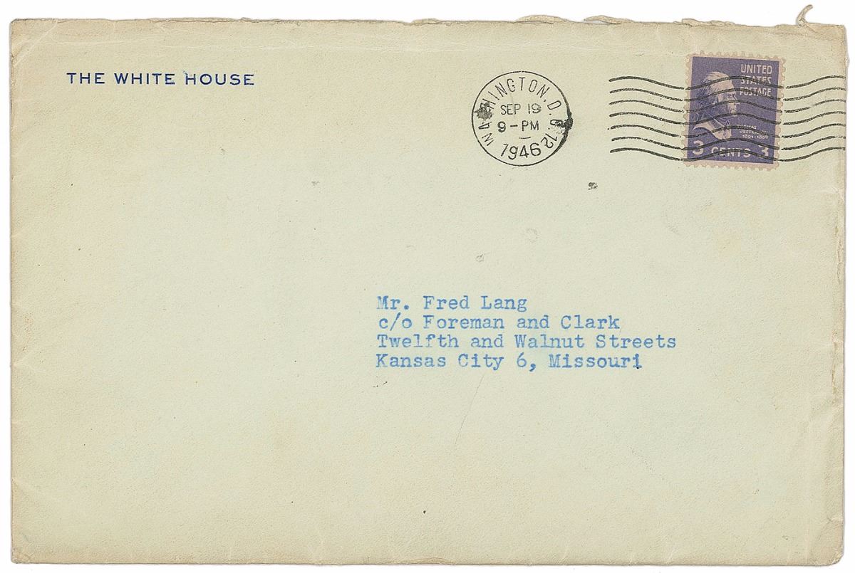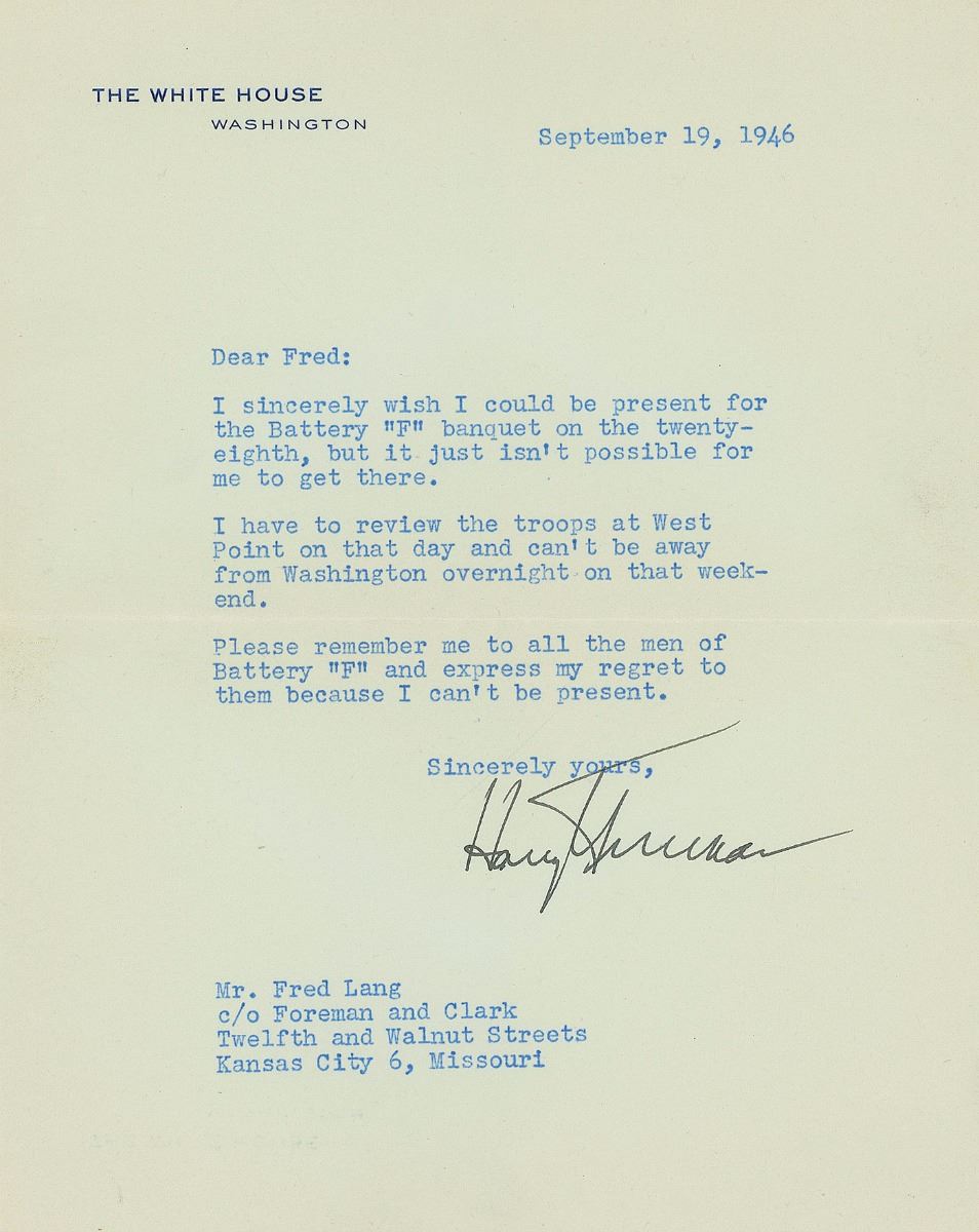 TLS as president, one page, 7 x 8.75, White House letterhead, September 19, 1946. Letter to Fred Lang, in full: “I sincerely wish I could be present for the Battery ‘F’ banquet on the twenty-eighth, but it just isn’t possible for me to get there. I have to review the troops at West Point on that day and can’t be away from Washington overnight on that weekend. Please remember me to all the men of Battery ‘F’ and express my regret to them because I can’t be present.” In fine condition. Accompanied by the original mailing envelope.