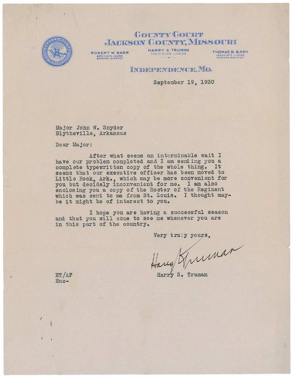 TLS, one page, 8.5 x 11, Jackson County Court letterhead, September 19, 1930. Letter to John W. Synder, in part: “After what seems an interminable wait I have our problem completed and I am sending you a complete typewritten copy of the whole thing. It seems that our executive officer has been moved to Little Rock, Ark., which may be more convenient for you but decidedly inconvenient for me. I am also enclosing you a copy of the Roster of the Regiment which was sent to me from St. Louis. I thought maybe it might be of interest to you.” Some small edge tears, trivial creasing, and light rusty paperclip marks to top and bottom edges, otherwise fine condition. Accompanied by the aforementioned roster. Future Secretary of the Treasury Snyder befriended Truman two years earlier when the pair served together in the US Army Reserves after World War I.