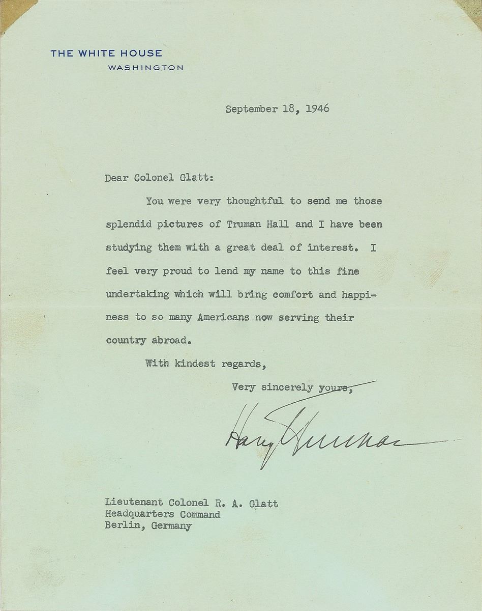 TLS as president, one page, 7 x 8.75, White House letterhead, September 18, 1946. Letter to Lieutenant Colonel R. A. Glatt, in full: “You were very thoughtful to send me those splendid pictures of Truman Hall and I have been studying them with a great deal of interest. I feel very proud to lend my name to this fine undertaking which will bring comfort and happiness to so many Americans now serving their country abroad.” In fine condition.