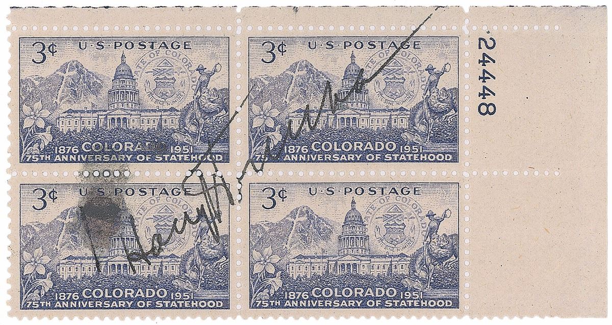 Block of four three-cent postage stamps honoring the 75th anniversary of the statehood of Colorado, 4 x 2, signed diagonally in fountain pen. A large ink blot to the left side, otherwise fine condition.