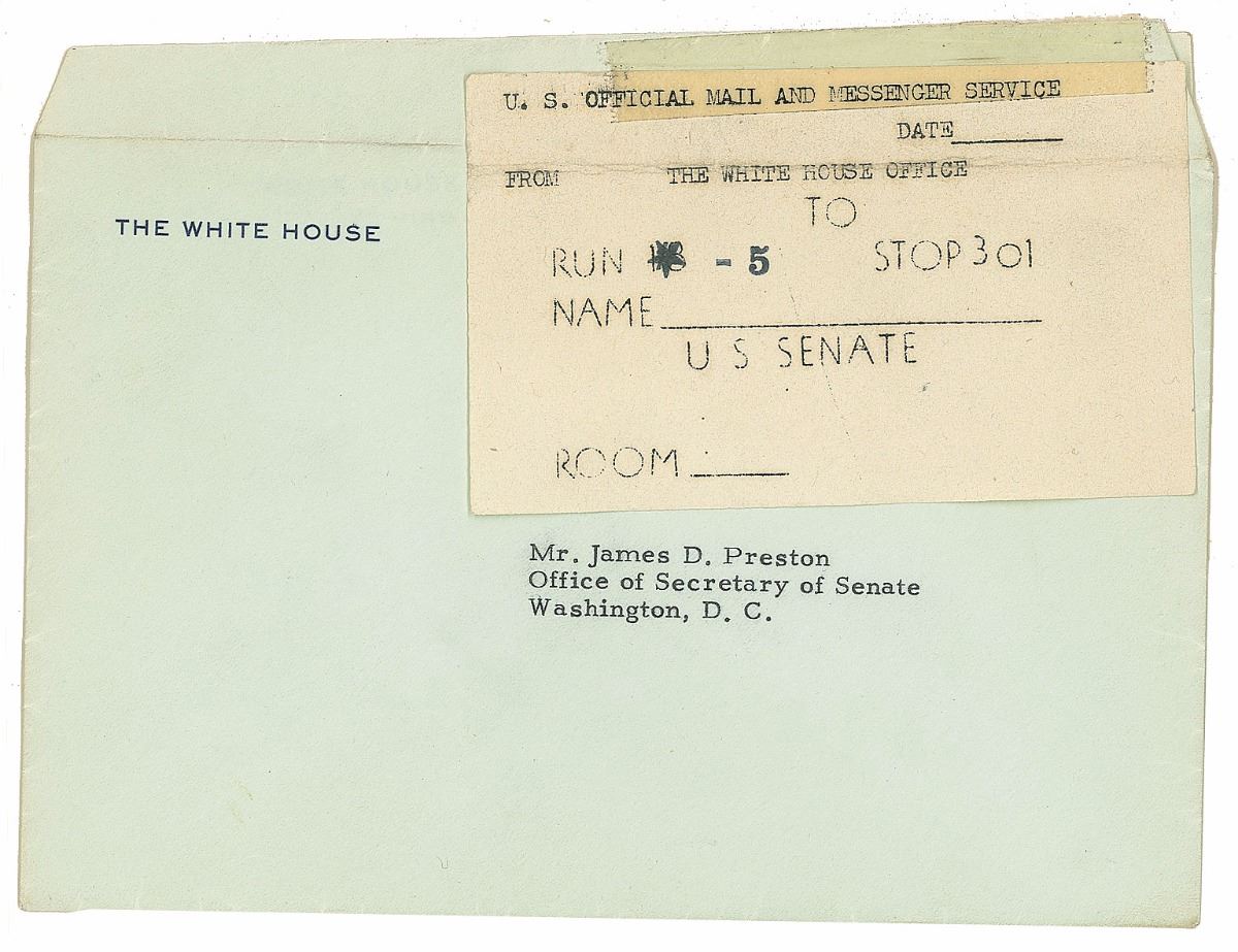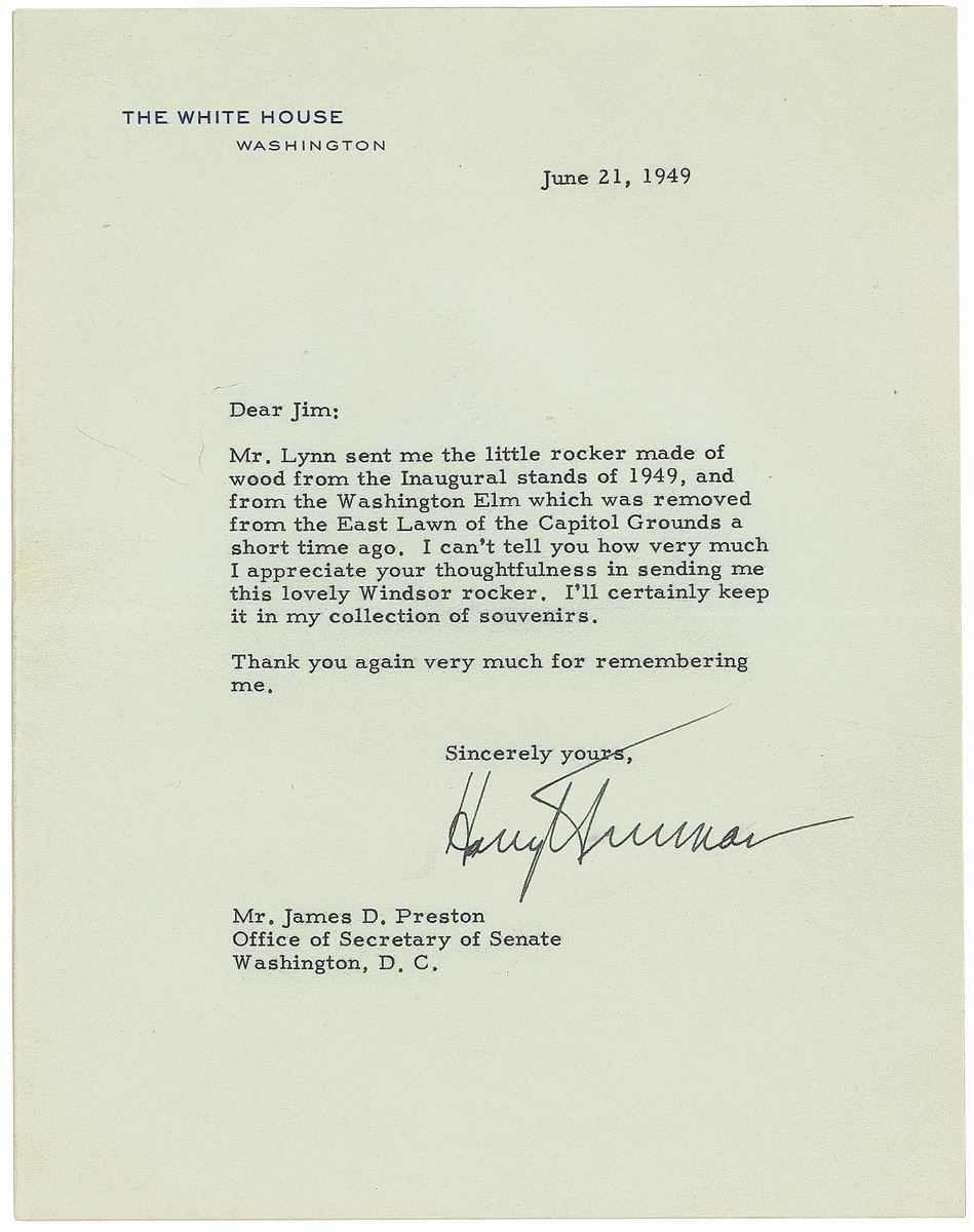 TLS as president, one page, 7 x 8.75, White House letterhead, June 21, 1949. Letter to James D. Preston, the superintendent of the Senate Press Gallery, in full: “Mr. Lynn sent me the little rocker made of wood from the Inaugural stands of 1949, and from the Washington Elm which was removed from the East Lawn of the Capitol Grounds a short time ago. I can’t tell you how very much I appreciate your thoughtfulness in sending me his lovely Windsor rocker. I’ll certainly keep it in my collection of souvenirs. Thank you again very much for remembering me.” Affixed to an off-white 8.5 x 11.25 sheet. In fine condition. Accompanied by a US Official Mail and Messenger Service tag taped to the original mailing envelope, the latter of which is affixed to the top reverse edge of the letter.