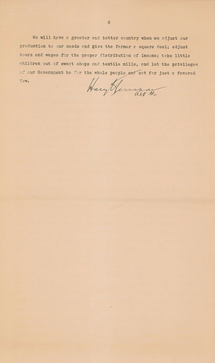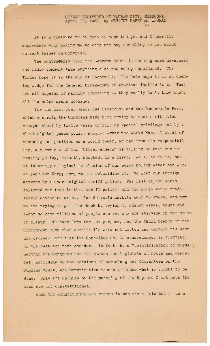 Mimeographed typed manuscript signed “Harry S. Truman, U.S.S. Mo.,” six pages, 8.5 x 14, April 1937. Manuscript headed “Speech Delivered at Kansas City, Missouri, April 19, 1937, by Senator Harry S. Truman,” on the controversial subject of packing the Supreme Court. After tracing the issue of the Court’s legislative powers—as well as the changing number of Justices—from the time of the Constitutional Convention, through the Civil War and reconstruction, to his current time, Truman continues (in part):