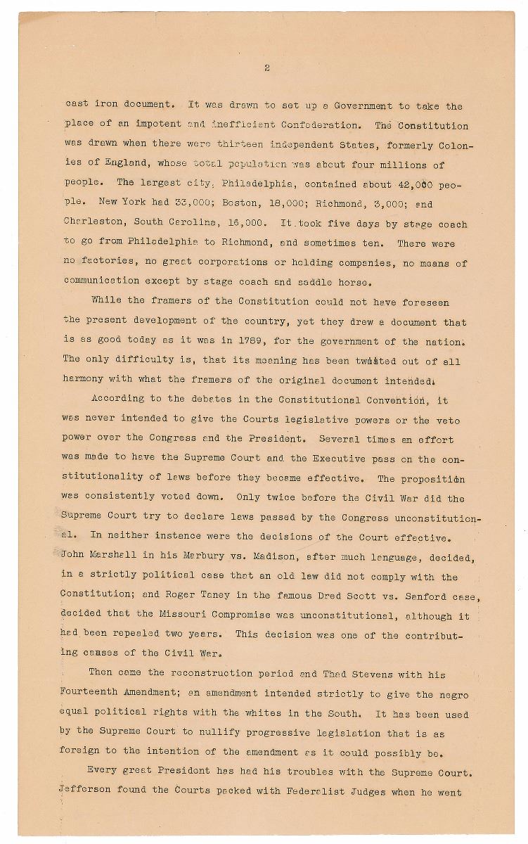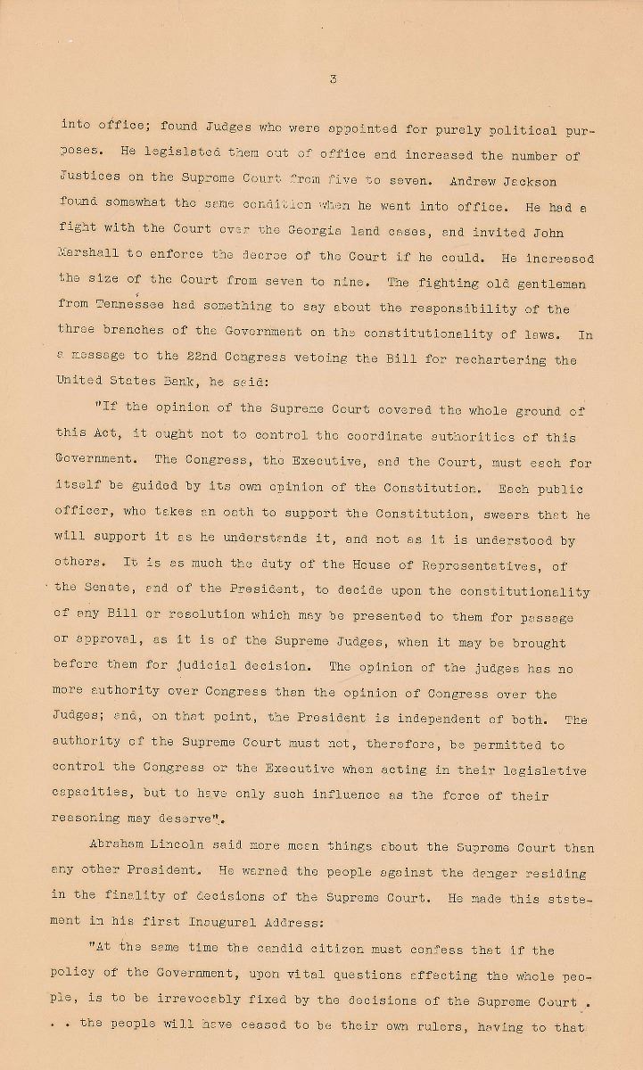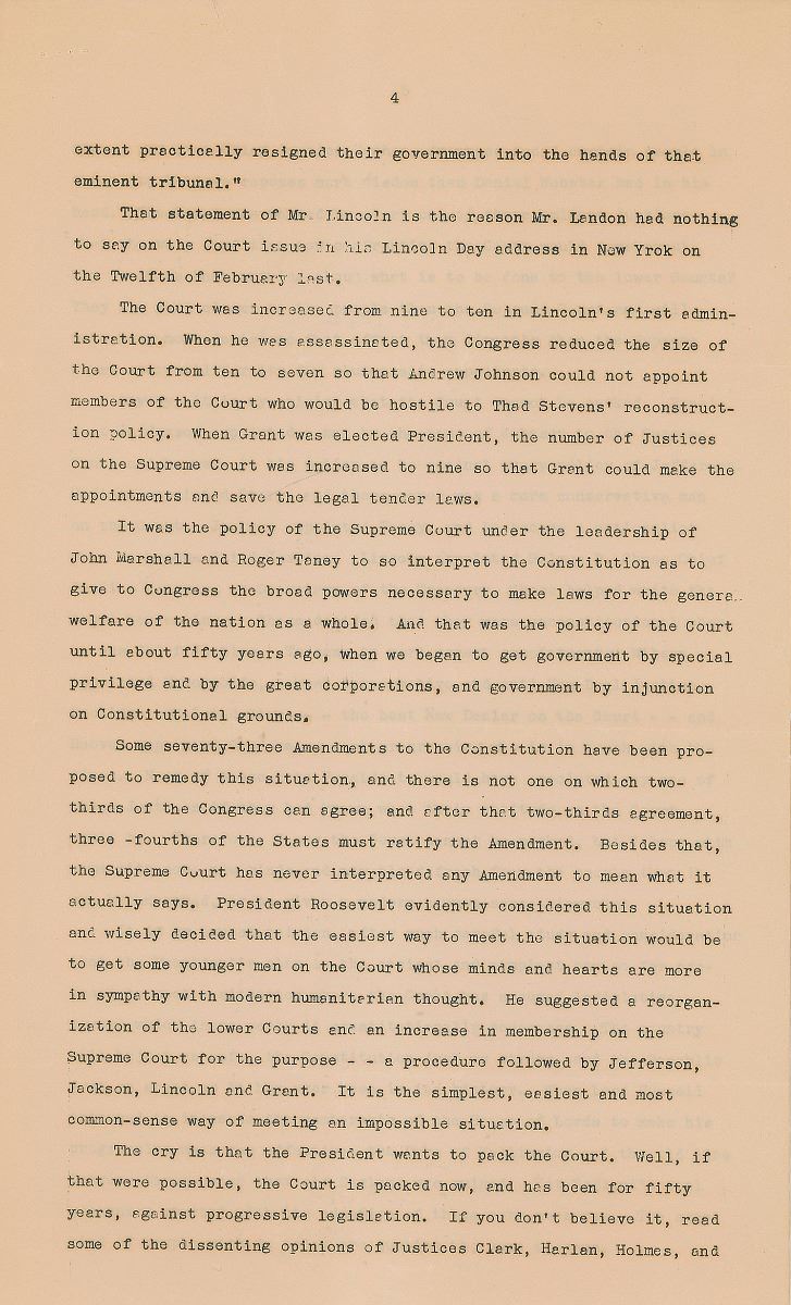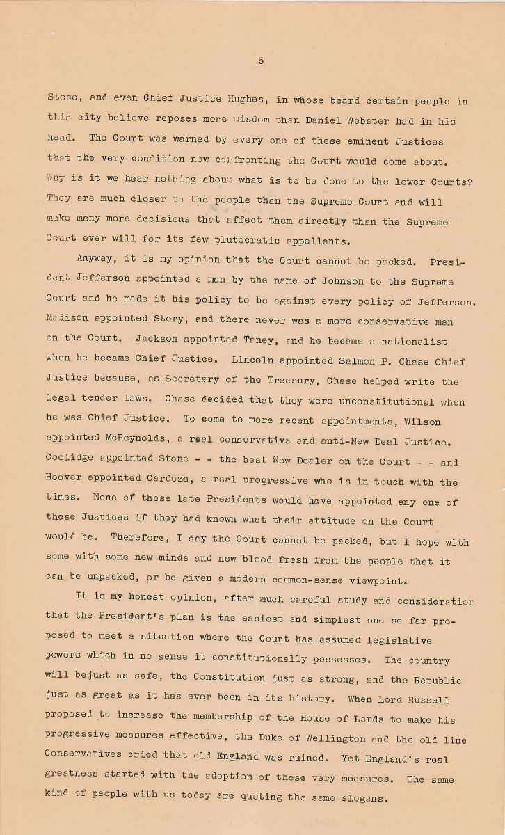 …Anyway, it is my opinion that the Court cannot be packed. President Jefferson appointed a man by the name of Johnson to the Supreme Court and he made it his policy to be against every policy of Jefferson…Lincoln appointed Salmon P. Chase Chief Justice because, as Secretary of the Treasury, Chase helped write the legal tender laws. Chase decided that they were unconstitutional when he was Chief Justice. To come to more recent appointments, Wilson appointed McReynolds, a real conservative and anti-New Deal Justice. Coolidge appointed Stone—the best New Dealer on the Court—and Hoover appointed Cardozo, a real progressive who is in touch with the ties. None of these late Presidents would have appointed any one of these Justices if they had known what their attitude on the Court would be. Therefore, I say the Court cannot be packed, but I hope with some new minds and new blood fresh from the people that it can be unpacked, or be given a modern common sense viewpoint.
