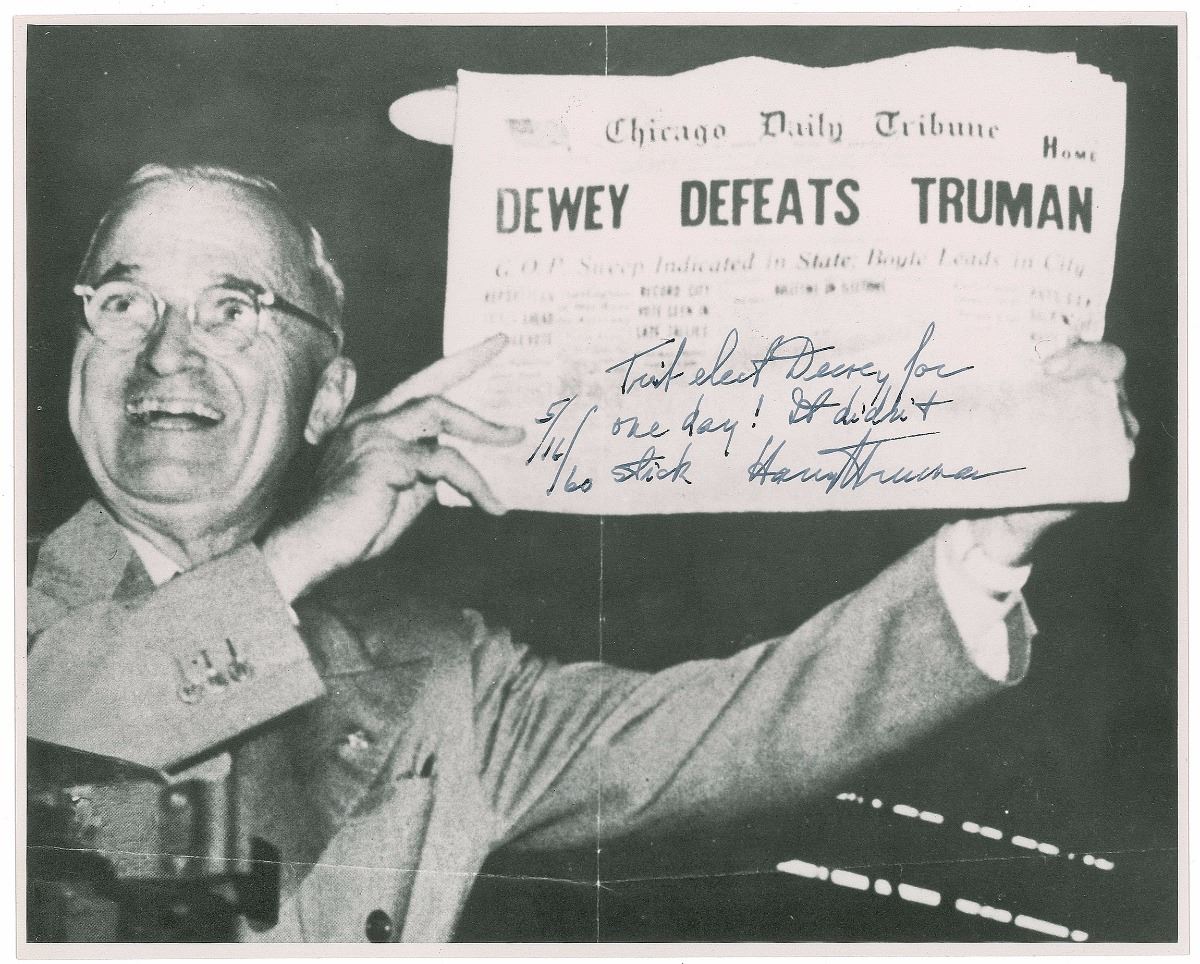 When the decision to print this paper was made, returns were coming in very slowly and time was running out before the Chicago Daily Tribune’s deadline. The pro-Republican Tribune staff, based on the early returns, decided Dewey would be the next president. After the newspaper was delivered to the street, more returns came in and showed that Truman would be reelected. Despite their scramble to recover their mistaken papers, about two thousand copies were unaccounted for. Showing Truman gleefully displaying the erroneous paper on his train the next morning, this is one of the most famous political photos in US history. The inclusion of an original White House gift inscribed by the president to his vice president makes this lot all the more unique. A fantastic pairing, with the photo bearing one of the longest and most clever inscriptions we have seen on this famous image.
