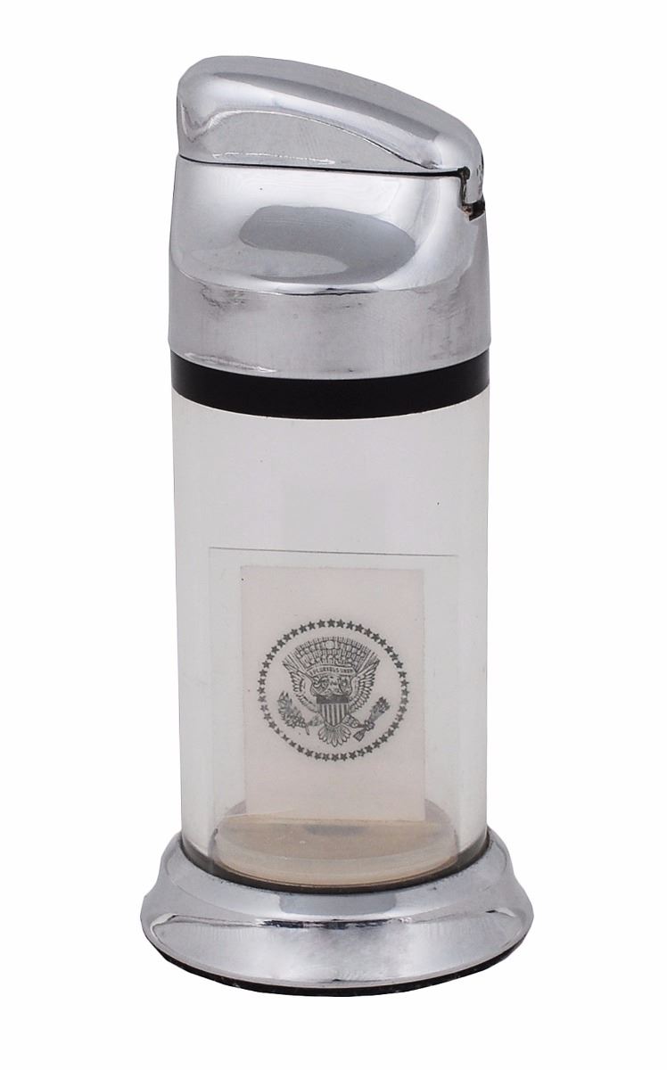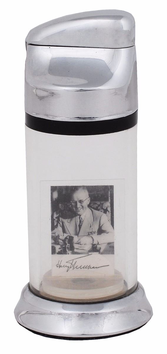 Two extraordinary items: a choice matte-finish 9.5 x 7.75 photo of Truman holding up the iconic ‘Dewey Defeats Truman’ issue of the Chicago Tribune, signed in fountain pen, “Trib elect Dewey for one day! It didn’t stick. Harry S. Truman, 5/16/60”; and a unique Ritepoint Table-Desk Roman Classic cigarette lighter featuring a small image of Truman inside, signed and inscribed on the box in fountain pen to his vice president, “To Hon. Alben Barkley, From the President.” Signed photo and lighter in very fine condition; lighter presentation box in very good condition.
