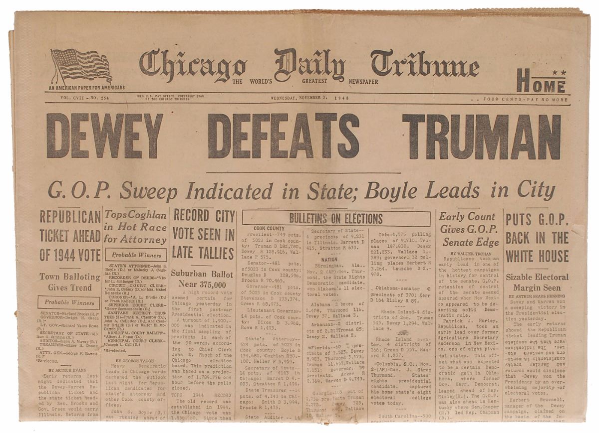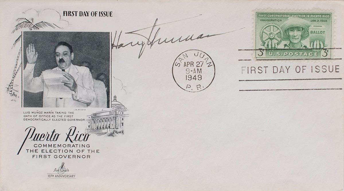 Two items: a rare complete issue of the Chicago Daily Tribune of November 3, 1948, 17 x 24, featuring the iconic banner headline "Dewey Defeats Truman”; and an FDC with a cachet honoring the election of Luis Munoz Marin as the first governor of Puerto Rico, signed in black ink by Truman, postmarked April 27, 1949. In overall very good to fine condition. When the decision to print this paper was made, returns were coming in very slowly and time was running out before the deadline for the edition. The Tribune staff—including many inexperienced workers brought in due to a strike at the paper—decided Dewey would be the next President and went to press. Along with the obvious incorrect information, the workers also accidentally printed five lines in the far right column upside down, a tell-tale point of issue of this edition. After the newspaper was delivered to the street, more returns came in and showed that Truman would in fact be reelected. The already delivered ‘error’ newspapers were gathered for return by staff members sent out to pick them up from newsstands and homes in the Chicago area. Original, entirely complete editions of this newspaper are becoming increasingly scarce, especially in this nice of condition.