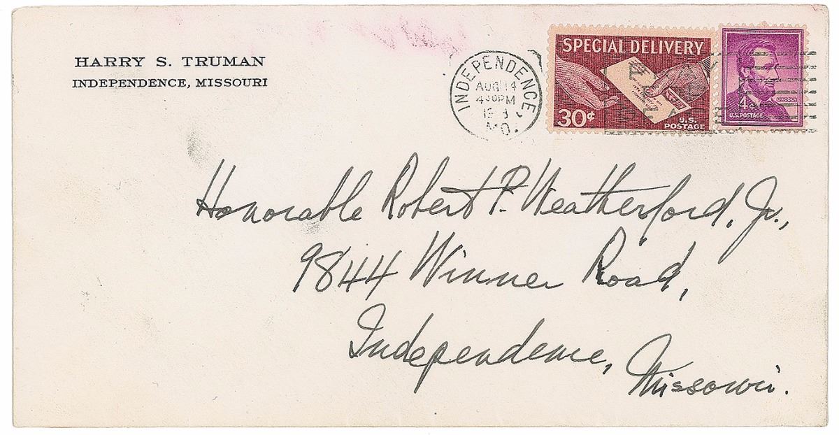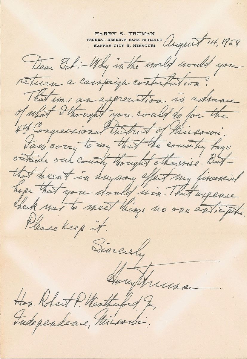 ALS, one page, 7.25 x 10.5, personal letterhead, August 14, 1958. Letter to Robert P. Weatherford, Jr., the mayor of Independence, Missouri. In full: “Why in the world would you return a campaign contribution? That was an appreciation in advance of what I thought you could do for the 4th Congressional District of Missouri. I am sorry to say that the country boys outside our county thought otherwise. But—that doesn’t in any way affect my financial hope that you would win. That expense check was to meet things no one anticipated. Please keep it.” In very good to fine condition, with scattered light irregular toning. Accompanied by the original mailing envelope addressed in his own hand.