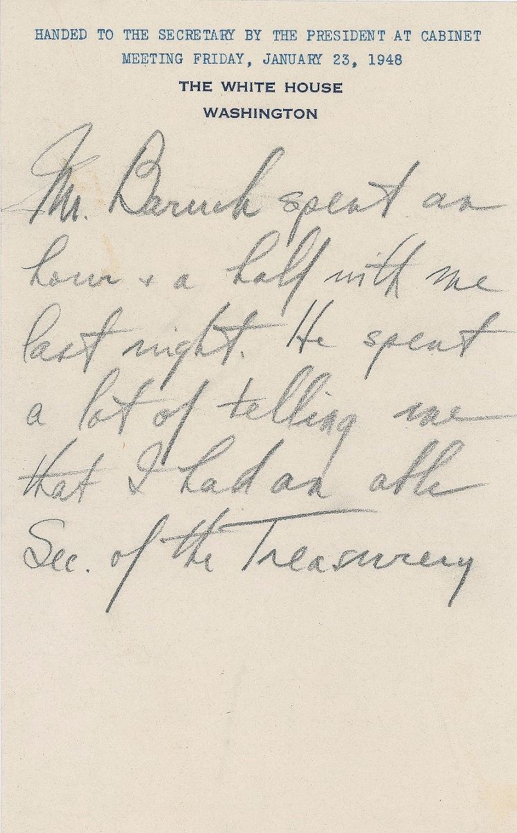 Handwritten note in pencil as president, unsigned, one page, 5 x 8, White House letterhead, January 23, 1948. Note to Secretary of the Treasury John W. Snyder, headed at the top in type, “Handed to the Secretary by the President at Cabinet Meeting Friday, January 23, 1948.” In full: “Mr. Baruch spent an hour & a half with me last night. He spent a lot of [time] telling me that I had an able Sec. of the Treasury.” In fine condition. Accompanied by a 1968 TLS by Bess Truman.