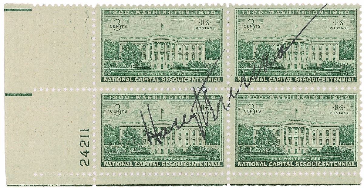 Block of four green three-cent postage stamps depicting the White House and honoring the sesquicentennial of Washington as the national capital, 4 x 2, signed diagonally in fountain pen. In fine condition.