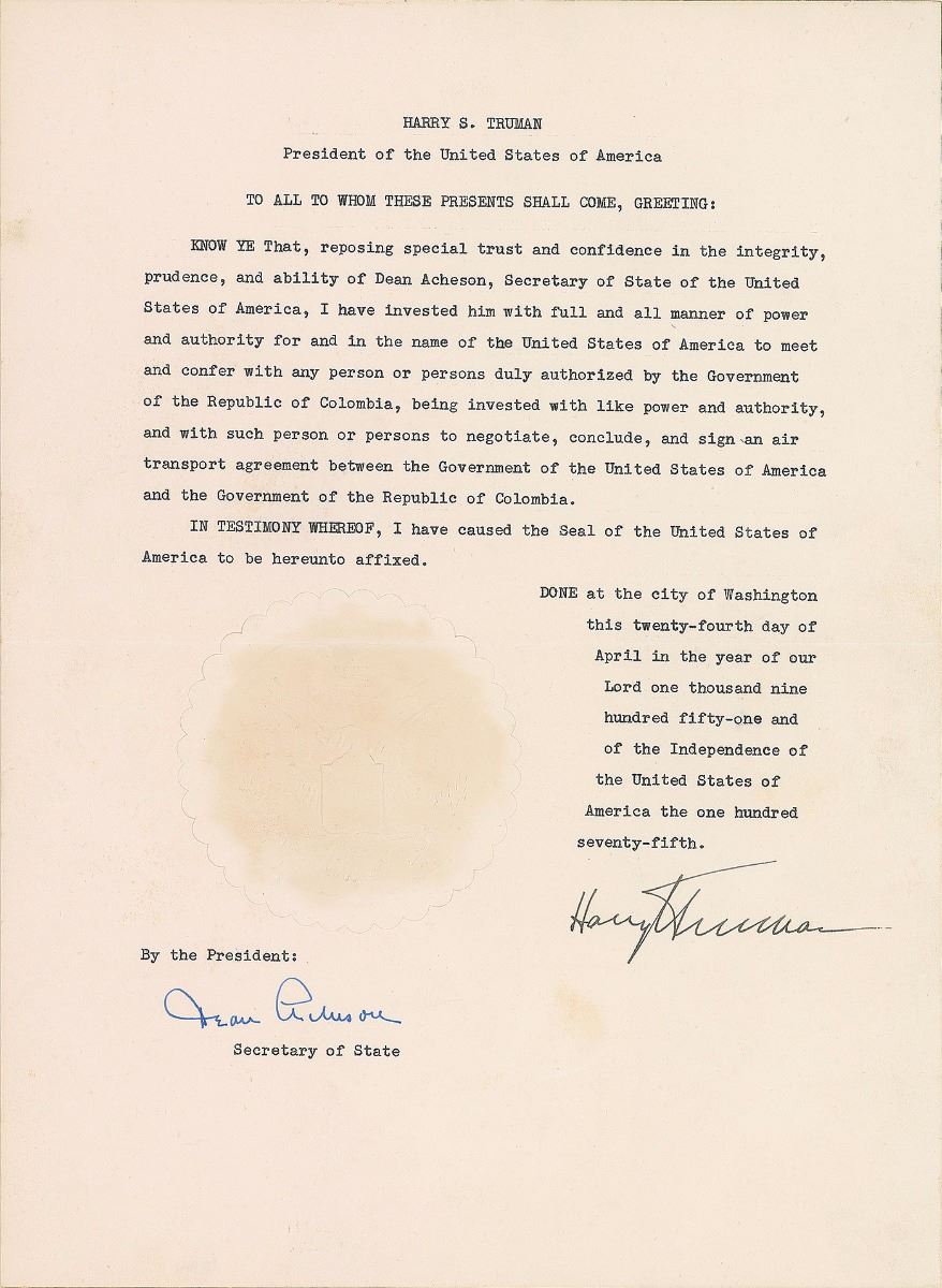 DS as president, one page, 10.25 x 14, April 24, 1951. President Truman authorizes Secretary of State Dean Acheson “to negotiate, conclude, and sign an air transport agreement between the Government of the United States of America and the Government of the Republic of Colombia.” Signed at the conclusion in fountain pen by Truman and countersigned by Acheson. In fine condition. Originates from the estate of a gentleman who drafted official documents and treaties for the government and couriered them to the president himself. In the course of his career he was able to retain several examples and duplicates of these documents.