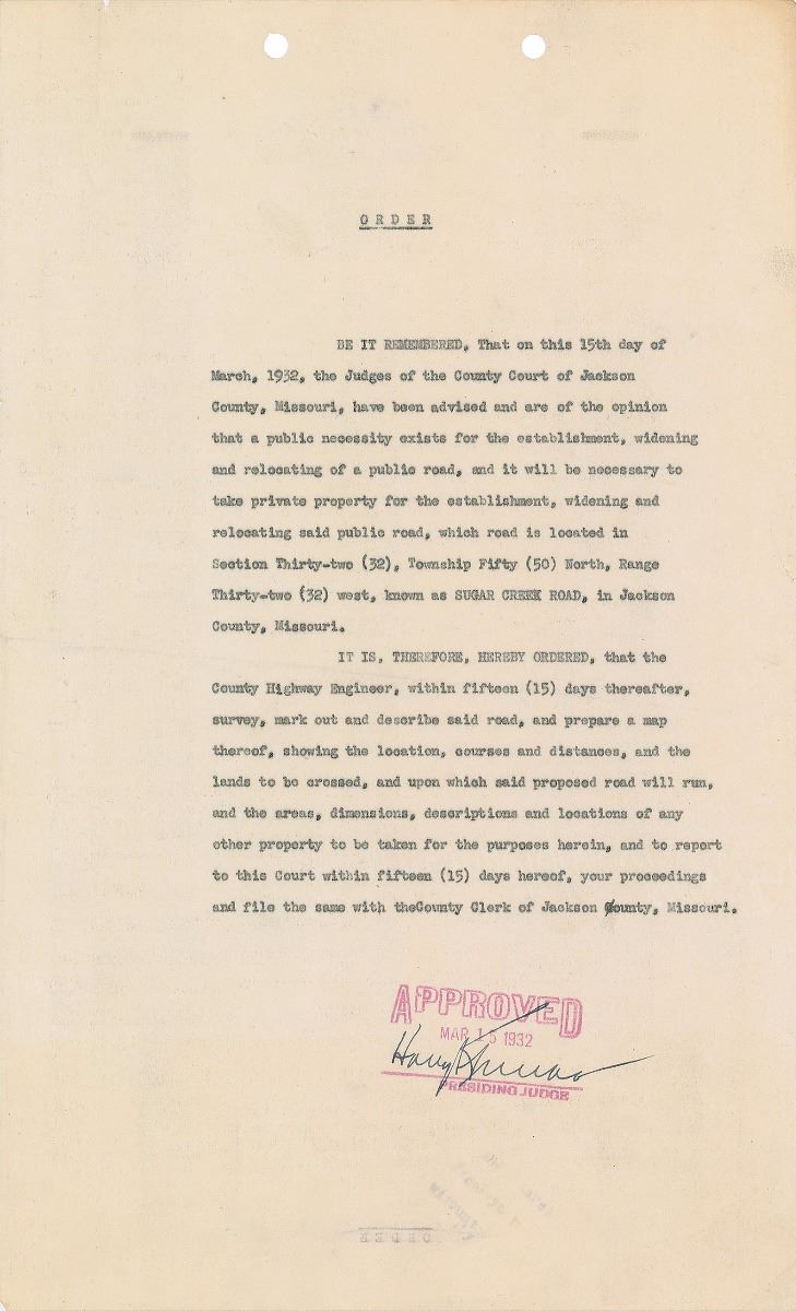 DS, one onionskin page, 8.5 x 14, March 15, 1932. Order issued by the Judges of the County Court of Jackson, County, Missouri directing “the County Highway Engineer” to prepare a map for the “widening and relocating of a public road…known as Sugar Creek Road.” Signed at the conclusion in black ink by Truman as the presiding judge. In fine condition.