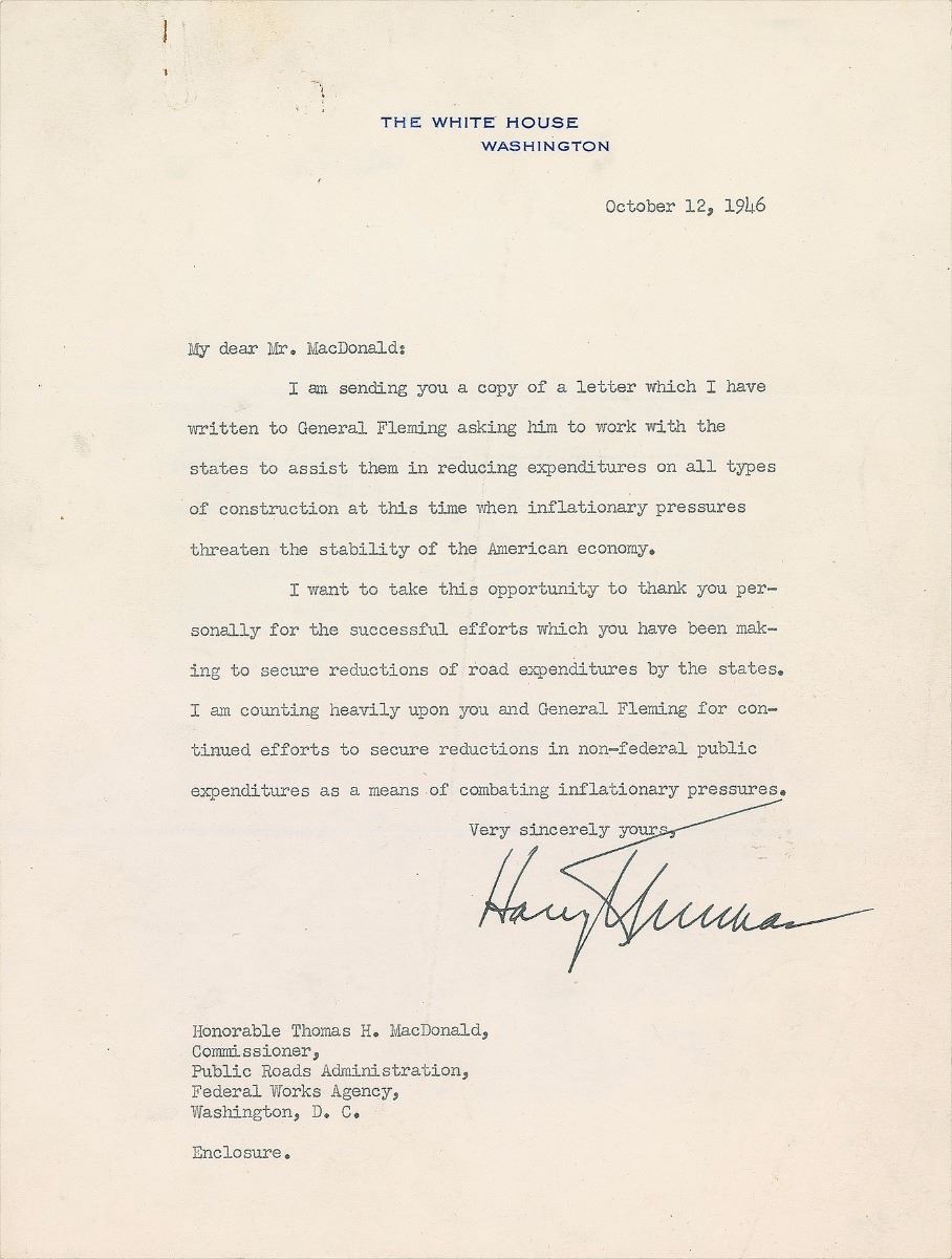 TLS as president, one page, 8 x 10.5, White House letterhead, October 12, 1946. Letter to Thomas H. MacDonald, in full: “I am sending you a copy of a letter which I have written to General Fleming asking him to work with the states to assist them in reducing expenditures on all types of construction at this time when inflationary pressures threaten the stability of the American economy. I want to take this opportunity to thank you personally for the successful efforts which you have been making to secure reductions of road expenditures by the states. I am counting heavily upon you and General Fleming for continued efforts to secure reductions in non-federal public expenditures as a means of combating inflationary pressures.” In fine condition.