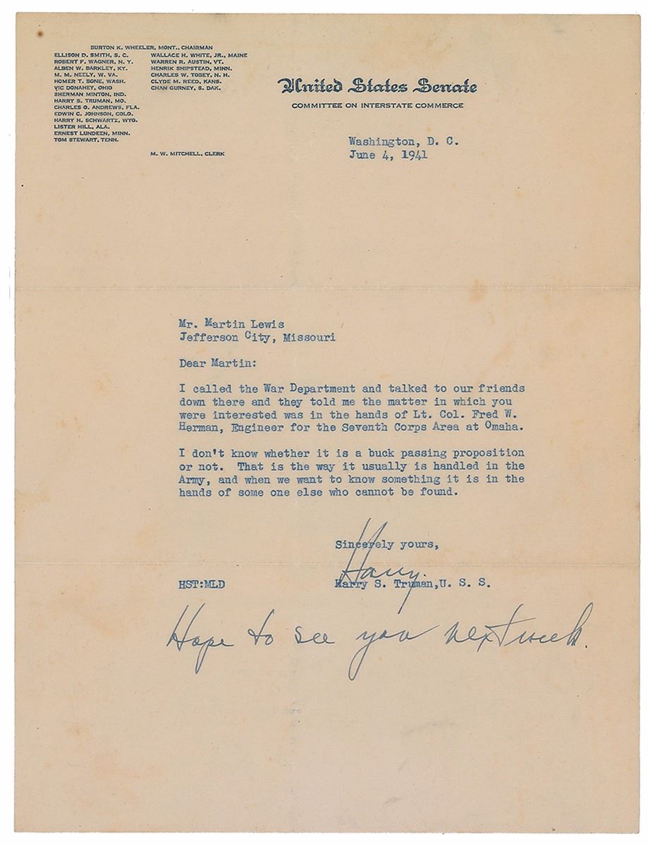 TLS signed “Harry,” one page, 8 x 10.5, United States Senate letterhead, June 4, 1941. Letter to Martin Lewis, in full: “I called the War Department and talked to our friends down there and they told me the matter in which you were interested was in the hands of Lt. Col. Fred W. Herman, Engineer for the Seventh Corps Area at Omaha. I don’t know whether it is a buck passing proposition or not. That is the way it usually is handled in the Army, and when we want to know something it is in the hands of some one else who cannot be found.” Truman adds a brief handwritten postscript, “Hope to see you next week.” Encapsulated in a Mylar sleeve. In fine condition, with intersecting folds (one horizontal fold passing through the first letter of the signature), a spot of soiling, and trivial toning and creasing. A desirable letter featuring one of Truman’s famous phrases.