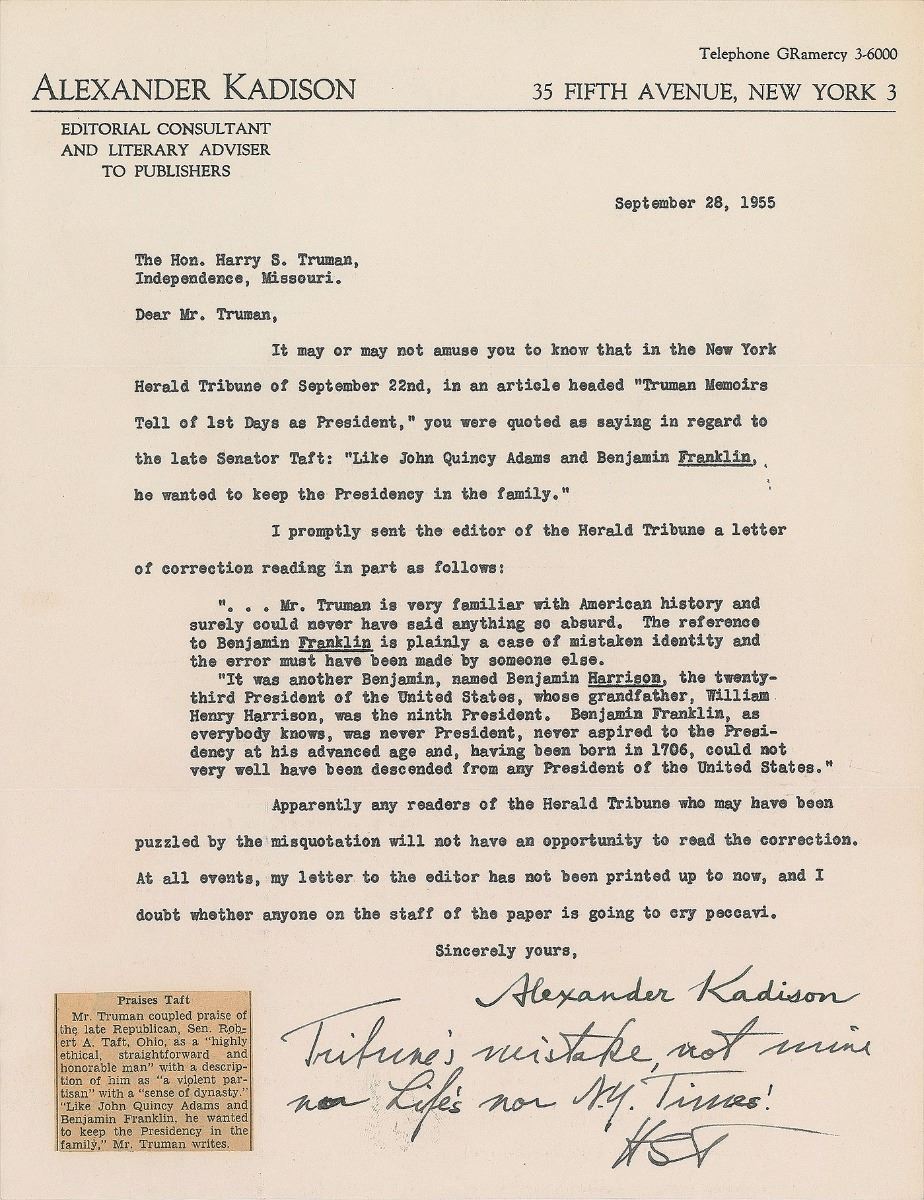 ANS signed “HST,” one page, 8.5 x 11, October 3, 1955. Penned at the close of letter written to him by Alexander Kadison concerning a misquote in the New York Herald Tribune in which Truman purportedly stated, ‘Like John Quincy Adams and Benjamin Franklin, he wanted to keep the Presidency in the family.’ Truman’s note, in full: “Tribune’s mistake, not mine, nor Life’s nor N. Y. Times!” The original clipping affixed to lower left corner. In fine condition. Accompanied by the original mailing envelope, addressed in Truman’s own hand.