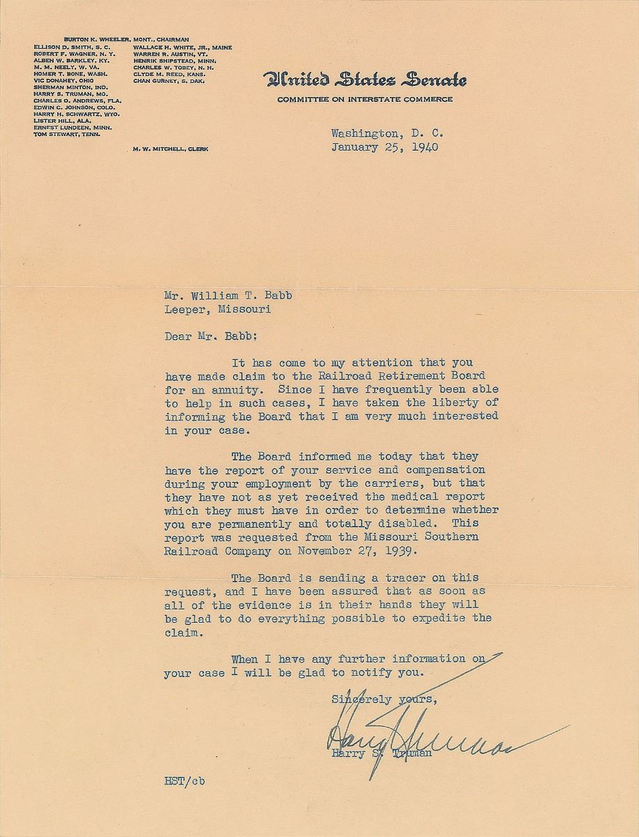 War-dated TLS, one page, 8 x 10.5, United States Senate letterhead, January 25, 1940. Letter to William Babb, in part: “The Board informed me today that they have the report of your service and compensation during your employment by the carriers, but that they have not as yet received the medical report which they must have in order to determine whether you are permanently and totally disabled. This report was requested from the Missouri Southern Railroad Company on November 27, 1939. The Board is sending a tracer on this request, and I have been assured that as soon as all of the evidence is in their hands they will be glad to do everything possible to expedite the claim.” In fine condition. Accompanied by the original mailing envelope bearing a pre-printed facsimile franking signature.
