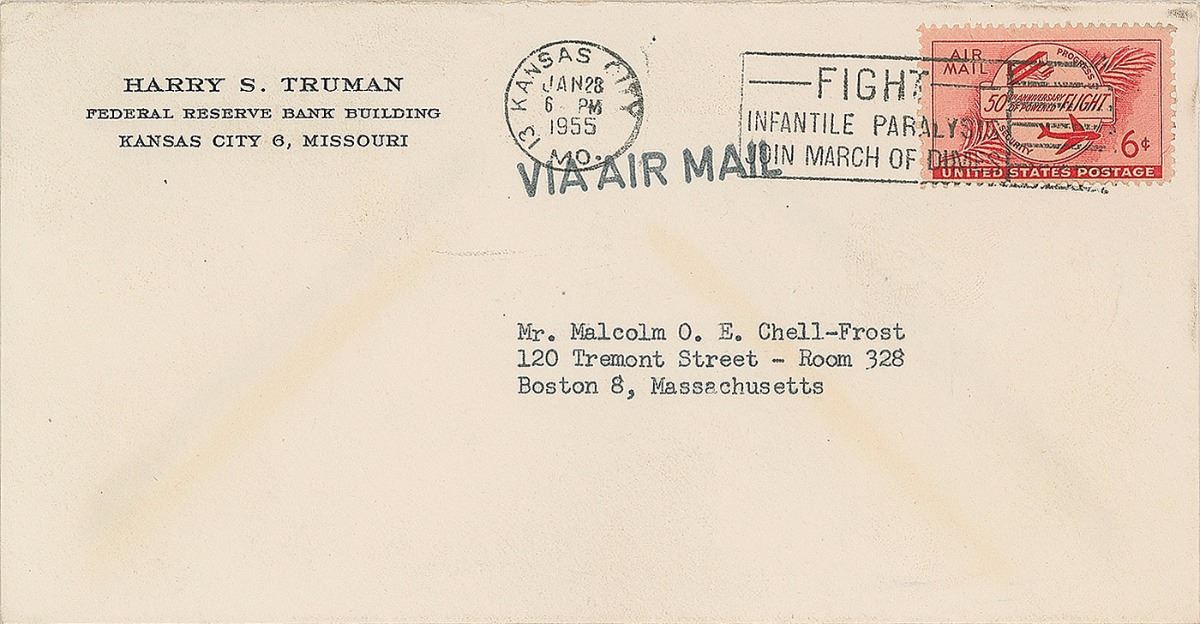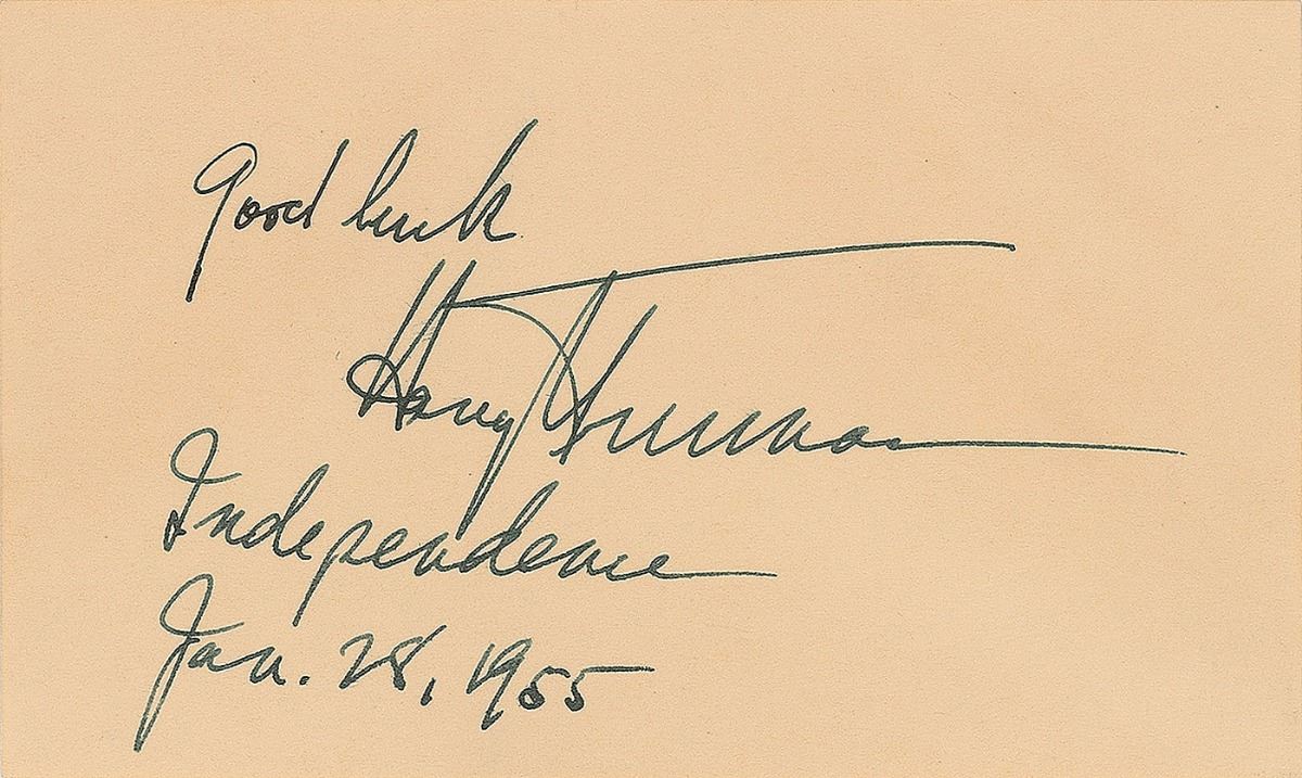 Fountain pen signature, “Good luck, Harry S. Truman, Independence, Jan. 28, 1955,” on an off-white 5 x 3 card. In fine condition. Accompanied by the original mailing envelope.
