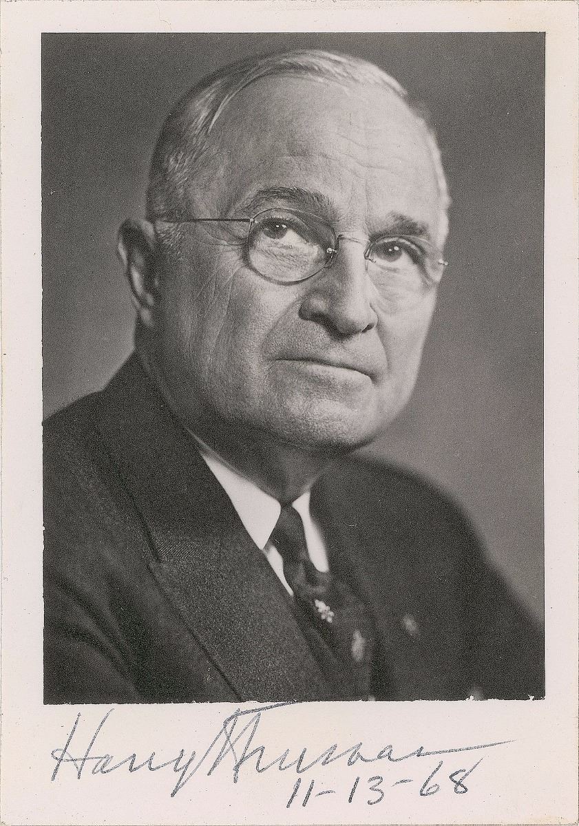 Matte-finish 3.5 x 5 portrait of Truman in a head-and-shoulders pose, signed in the lower border in black ballpoint, “Harry S. Truman, 11-13-1968.” In fine condition.