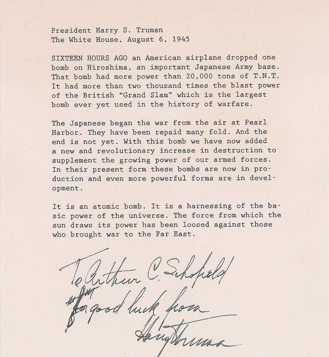 Souvenir typescript of a portion of Truman’s press release issued after the first atomic bomb was dropped on Hiroshima on August 6, 1945, one page, 7 x 7.75, signed and inscribed at the bottom in black ink, “To Arthur C. Schofield, good luck from, Harry S. Truman.” In part: “Sixteen hours ago an American airplane dropped one bomb on Hiroshima, an important Japanese Army base. That bomb had more than 20,000 tons of T.N.T. It had more than two thousand times the blast power of the British ‘Grand Slam’ which is the largest bomb ever yet used in the history of warfare…It is an atomic bomb. It is a harnessing of the basic power of the universe. The force from which the sun draws its power has been loosed against those who brought war to the Far East.” In fine condition.