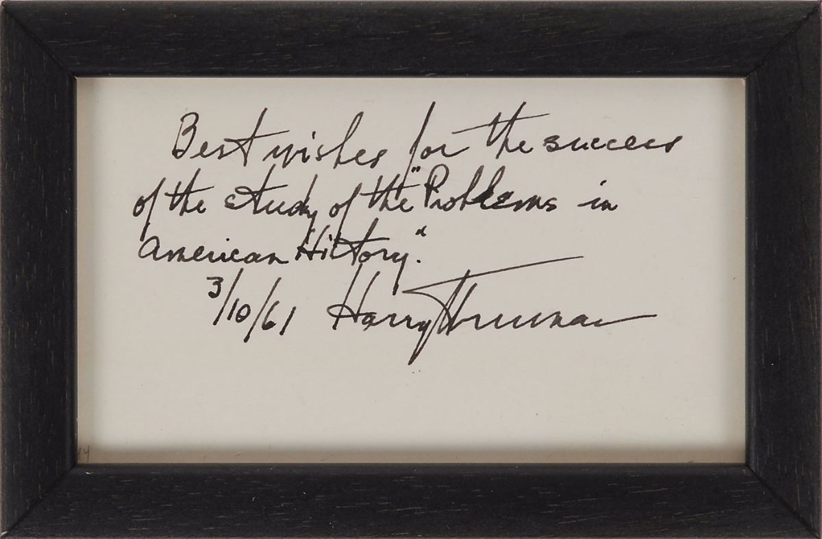 ANS, one page on a 4.75 x 2.75 card, March 10, 1961. In full: “Best wishes for the success of the study of the ‘Problems in American History.’” Framed and in fine condition.
