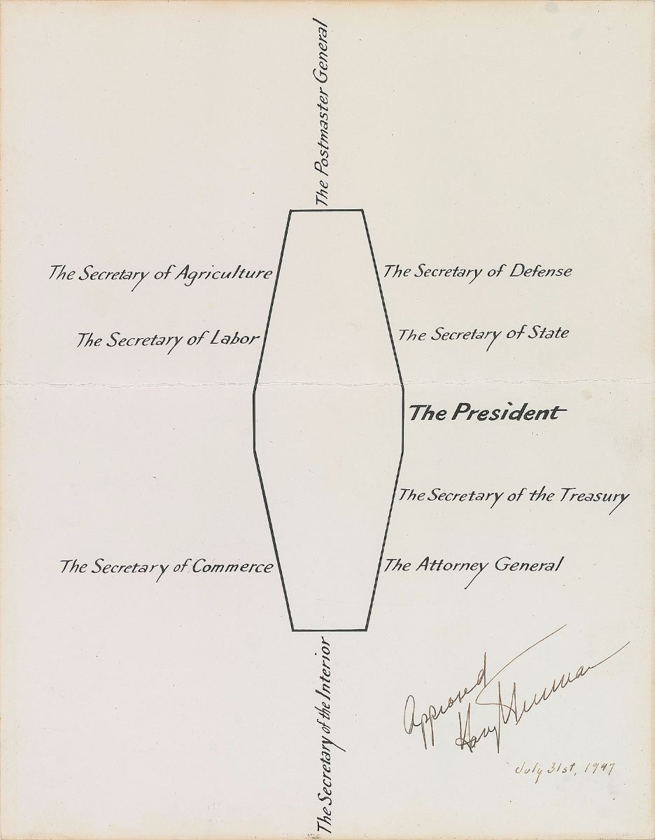 Unique seating chart, one cardstock page, 11 x 14, July 31, 1947, signed in fountain pen as president, “Approved, Harry S. Truman.” An official seating chart for the octagonal meeting table in the Cabinet Room in the White House, listing the president at the center, surrounded by his cabinet ministers including the secretaries of labor, agriculture, defense, state, treasury, interior, and commerce, the attorney general, and the postmaster general. In fine condition, with a central horizontal fold. The seating plan for cabinet meetings had to be revised following the National Security Act of 1947, which unified the branches of America’s armed forces and therefore abolished the positions of secretary of war and secretary of the navy; instead, the entirety of the military was to be overseen by the secretary of defense. Secretary of the Navy James Forrestal was promoted to the position and took this new seat on September 17, 1947. An extremely unusual format from an important transition period in the leadership of the American military.