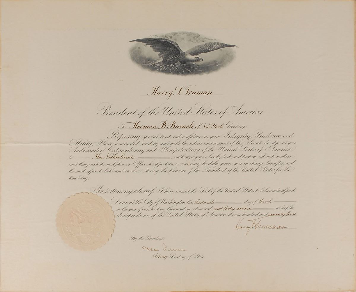 Partly-printed DS as president, one page, 22.5 x 18.5, March 13, 1947. President Truman appoints Herman B. Baruch as “Ambassador Extraordinary and Plenipotentiary of the United States of America to The Netherlands. Neatly signed at the conclusion by President Truman and countersigned by Acting Secretary of State Dean Acheson. The white paper seal affixed to the lower left remains intact. Affixed to a same-size sheet of cardstock and in fine condition, with some scattered rippling. Herman Baruch was the younger brother of noted financier and presidential advisor Bernard Baruch.