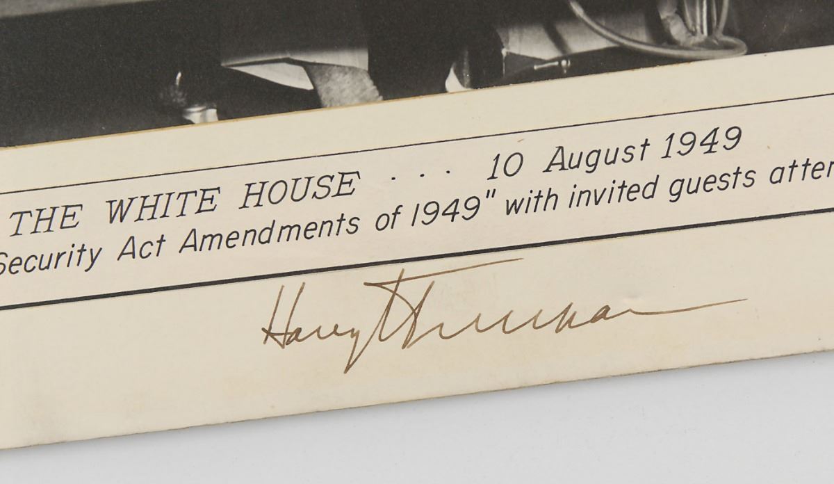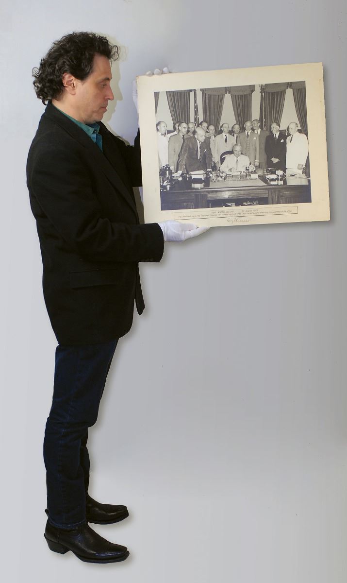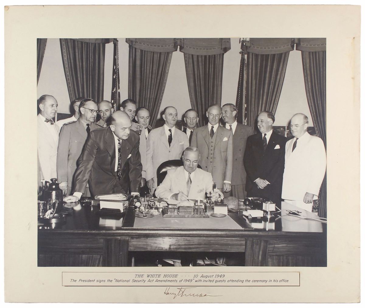 Impressively large matte-finish 19.5 x 15.5 photo of Truman signing the National Security Act Amendments of 1949, affixed to a 24 x 20 mount bearing a descriptive label, signed on the mount in fountain pen. Scattered marks and dings to the mount, an area of creasing to the upper right side, and a surface ding above the signature. This act amended the National Security Act of 1947, which was a major restructuring of the American military following World War II. The 1947 Act merged the Department of War and the Department of the Navy into the National Military Establishment. This 1949 amendment was important in unifying the Army, Navy, and Air Force under the control of the secretary of defense, and renamed the National Military Establishment as what it remains today—the Department of Defense. Among the dignitaries invited to the bill signing that are seen here surrounding Truman are: Louis A. Johnson, leaning on the desk; General Omar Bradley, seen over Johnson’s shoulder; Secretary of the Army Gordon Gray, behind Truman and with his eyes closed; and Secretary of the Navy Francis Matthews, to the right side. A remarkable image of an important moment in the modernization of the US military. Originally from the General Hoyt Vanderberg Estate.