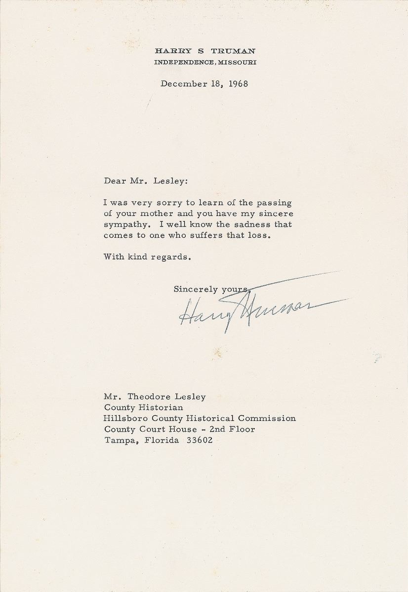 Two TLSs, each one page, 7.25 x 10.5, personal letterhead, dated 1968–1969. Both are to Theodore Lesley, historian of Hillsborough County, Florida. The first, in part: “I was very sorry to learn of the passing of your mother and you have my sincere sympathy. I well know the sadness that comes to one who suffers that loss.” The second, in part: “Thank you for…the book ‘To God Through Science’ by Father Patrick Yancey…the book will be given to the Truman Library to be made available for students who come here for reference and research.” In overall fine condition, with a couple of small light stains. Accompanied by the original mailing envelopes, both bearing pre-printed free franks.