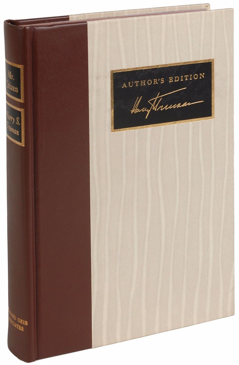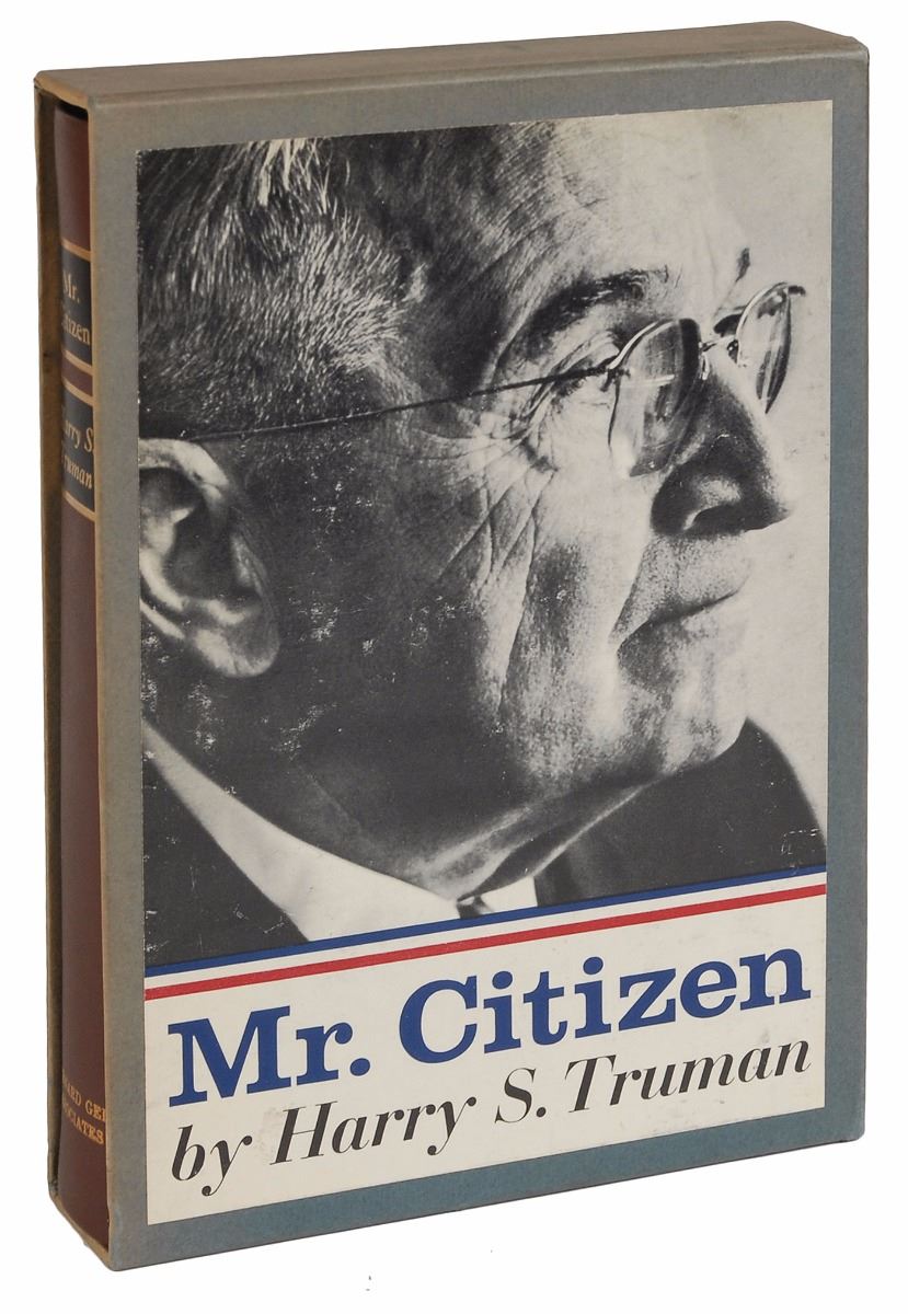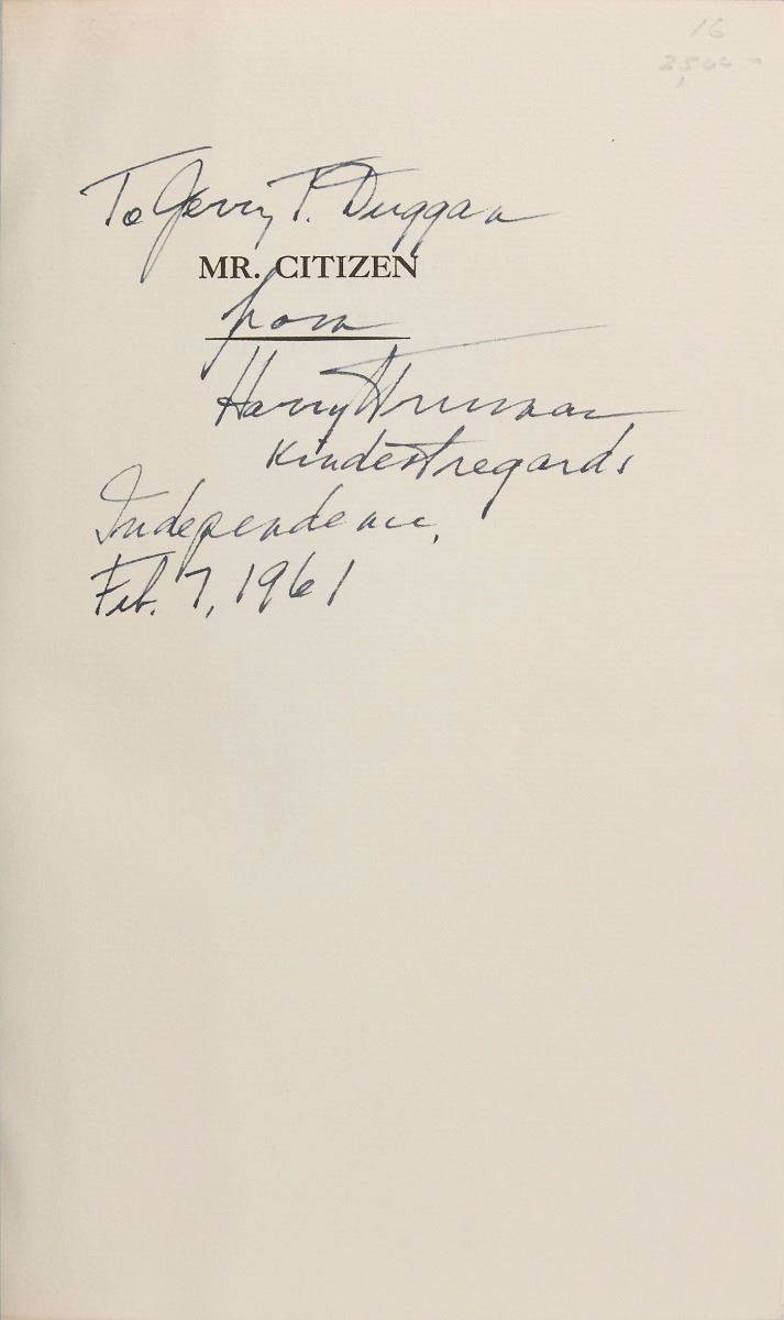 Signed book: Mr. Citizen. Later printing. NY: Bernard Geis Associates, 1960. Hardcover with slipcase, 6.5 x 9.5, 315 pages. Signed and inscribed on the half-title page in black ink, "To Jerry T. Duggan, from, Harry S. Truman, kindest regards, Independence, Feb. 7, 1961." Autographic condition: fine. Book condition: VG+/None in a VG slipcase.