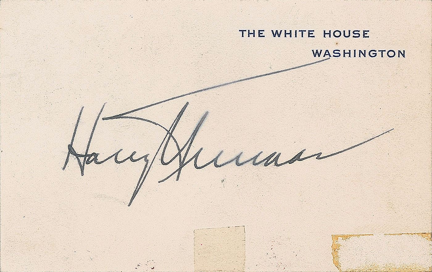 White House card signed in black ink by Truman, "Harry S. Truman." In very good condition, with light soiling, old tape stains to the lower edge and the reverse, and some slight blurring to areas of ink from moisture exposure.