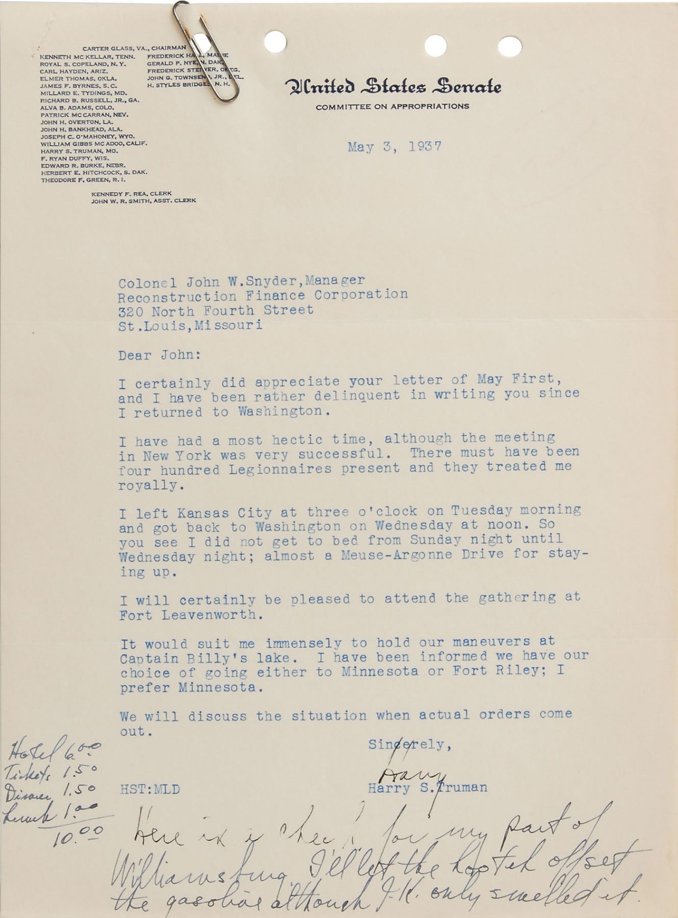 TLS signed “Harry,” one page, 8 x 10.5, United States Senate letterhead, May 3, 1937. Letter to his future secretary of the treasury, Col. John W. Snyder, in full: “I certainly did appreciate your letter of May First, and I have been rather delinquent in writing you since I returned to Washington. I have had a most hectic time, although the meeting in New York was very successful. There must have been four hundred Legionnaires present and they treated me royally. I left Kansas City at three o’clock on Tuesday morning and got back to Washington on Wednesday at noon. So you see I did not get to bed from Sunday night until Wednesday night; almost a Meuse-Argonne Drive for staying up. I will certainly be pleased to attend the gathering at Fort Leavenworth. It would suit me immensely to hold our maneuvers at Captain Billy’s lake. I have been informed we have our choice of going either to Minnesota or Fort Riley; I prefer Minnesota. We will discuss the situation when actual orders come out.” Truman adds a lengthy handwritten postscript below, ”Here is a check for my part of Williamsburg. I’ll let the hootel [sic] offset the gasoline although J.K. only smelled it,” and, in the left margin, Truman adds the total sum, “Hotel 6.00, Tickets 1.50, Dinner 1.50, Lunch 1.00, 10.00.” Includes the referenced Hamilton National Bank check, 6.25 x 2.75, filled out and signed by Truman, payable to Snyder for $10, May 3, 1937. In overall fine condition, with filing holes to the top of both the letter and un-cashed check.