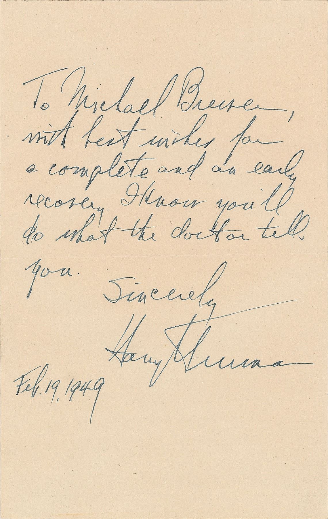 ANS as president, one page, 5 x 8, February 19, 1949. In part: "To Michael…with best wishes for a complete and an early recovery. I know you'll do what the doctor tells you." In fine condition.