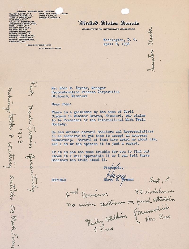 TLS signed “Harry,” one page, 8 x 10.5, US Senate letterhead, April 8, 1938. Letter to John W. Snyder, in full: “There is a gentleman by the name of Cyril Clemens in Webster Groves, Missouri, who claims to be President of the International Mark Twain Society. He has written several Senators and Representatives in an endeavor to get them to accept an honorary membership. Several of them have asked me about him, and I am of the opinion it is just a racket. If it is not too much trouble for you to find out about it I will appreciate it so I can tell these Senators the truth about it.” Snyder has written several notes regarding the inquiry in the borders, including “2nd Cousin” and “Pub. Mark Twain Quarterly.” In fine condition, with expected filing and staple holes to top. Accompanied by the retained carbon copy of Snyder’s response, indicating that Cyril Clemens is the author’s second cousin and his Society is a legitimate enterprise.