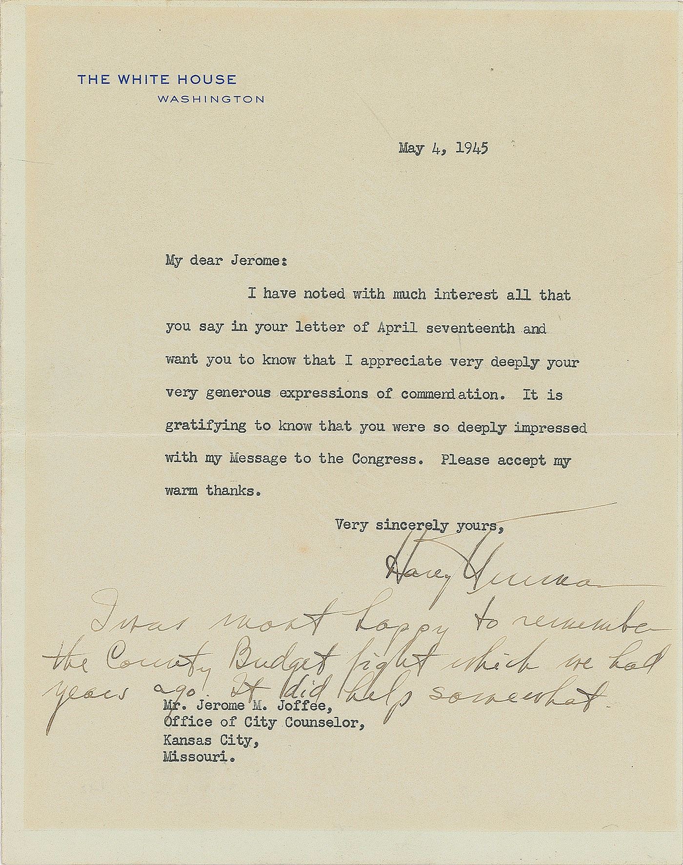 TLS as president, one page, 7 x 9, White House letterhead, May 4, 1945. Letter to Jerome M. Joffee, in full: "I have noted with much interest all that you say in your letter of April seventeenth and want you to know that I appreciate very deeply your very generous expressions of commendation. It is gratifying to know that you were so deeply impressed with my Message to the Congress. Please accept my warm thanks.” Truman adds a handwritten postscript: “I was most happy to remember the County Budget fight which we had years ago. It did help somewhat.” In fine condition, with a light block of toning from prior display. Accompanied by a copy of Joffee's referenced letter dated April 17, 1945.