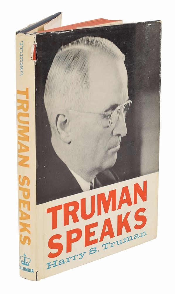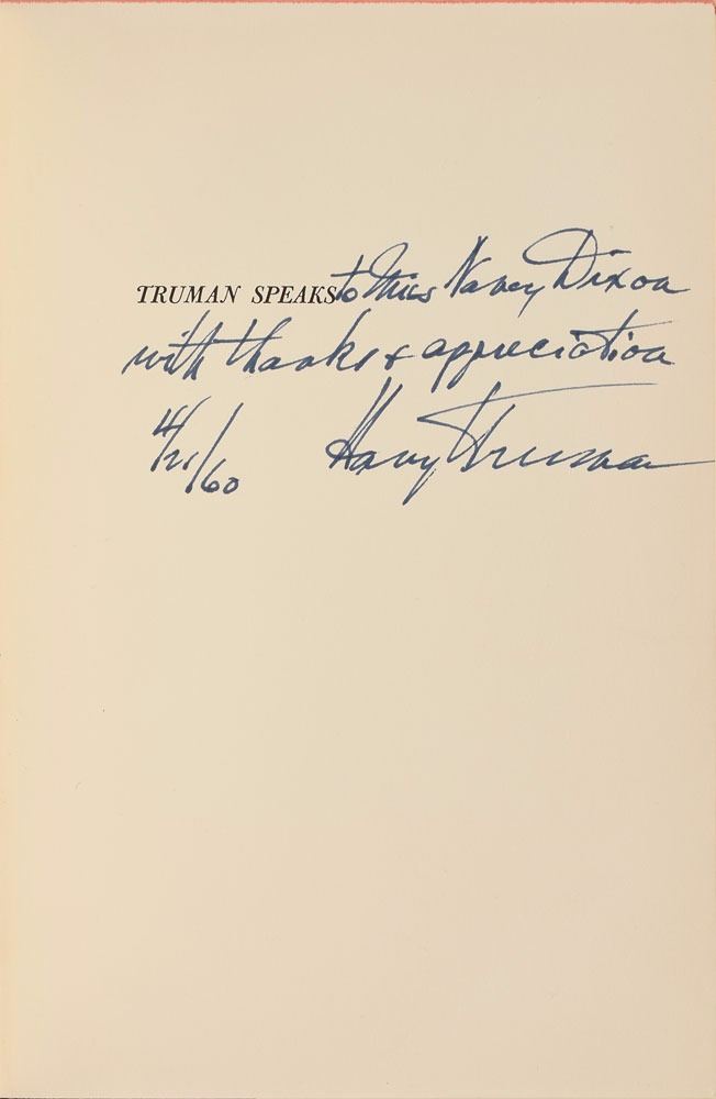 Signed book: Truman Speaks. First edition. NY: Columbia University Press, 1960. Hardcover with dust jacket, 5.75 x 8.25, 133 pages. Signed and inscribed on the half-title page in black ink, "To Miss Nancy Dixon, with thanks & appreciation, Harry S. Truman, 4/21/60." In fine condition, with some wear and chipping to the dust jacket.