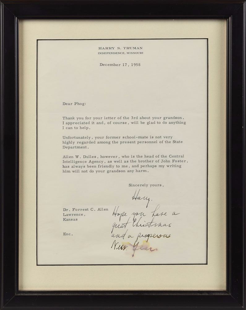 TLS signed “Harry,” one page, 6.75 x 8.75, personal letterhead, December 17, 1958. Letter to Hall of Fame basketball coach Phog Allen, in part: "Thank you for your letter of the 3rd about your grandson. I appreciated it and, of course, will be glad to do anything I can to help. Unfortunately, your former school-mate is not very highly regarded among the present personnel of the State Department. Allen W. Dulles, however, who is the head of the Central Intelligence Agency, as well as the brother of John Foster, has always been friendly to me, and perhaps my writing him will not do your grandson any harm." He adds a handwritten postscript, "Hope you have a great Christmas and a prosperous New Year." Matted and framed to an overall size of 9.75 x 12. In fine condition, with a water stain to the last two words of the postscript. Truman and Allen grew up not far from each other in Independence, Missouri, and attended school together; they maintained a lifelong friendship.