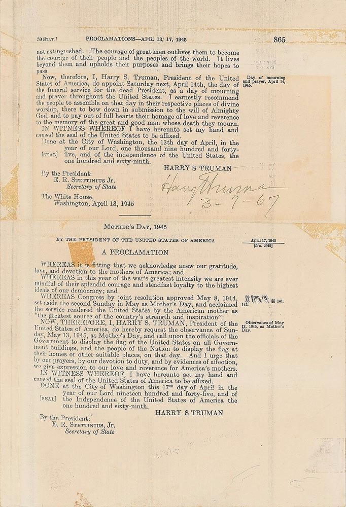 Ink signature, "Harry S. Truman, 3–7–67," on an off-white 7.5 x 11 book page from a 1945 Presidential Proclamation. In very good condition, with a block of light toning from prior display, and a few areas of old tape residue.