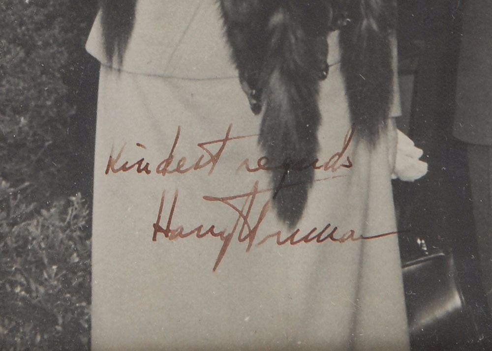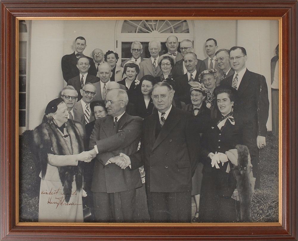 Oversized matte-finish 13 x 10 photo of Truman holding hands in a large group of people, signed in fountain pen, "Kindest regards, Harry S. Truman." Framed and in very good to fine condition, with a noticeable vertical crease to the far right side.