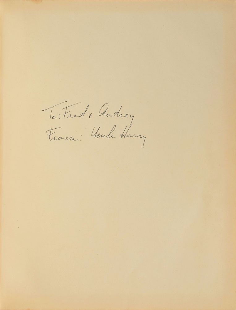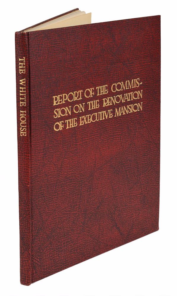 Signed book: Report of the Commission on the Renovation of the Executive Mansion. First edition. Washington, D.C.: United States Government Printing Office, 1952. Maroon leatherette hardcover, 8.75 x 11.25, 109 pages. Signed and inscribed on the first free end page in black ink, "To: Fred & Audrey, From: Uncle Harry." Includes the original cardboard slipcase. In fine condition, with light staining and wear to the slipcase.