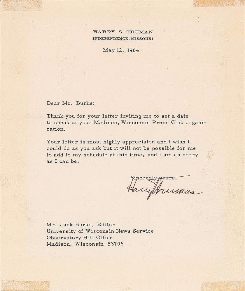 TLS, 7.25 x 8.5, personal letterhead, May 12, 1964. Letter to Jack Burke of the University of Wisconsin News Service, in full: "Thank you for your letter inviting me to set a date to speak at your Madison, Wisconsin Press Club organization. Your letter is most highly appreciated and I wish I could do as you ask but it will not be possible for me to add to my schedule at this time, and I am as sorry as I can be." In very good condition, with trimmed edges, intersecting folds, light toning, and old tape on the reverse of each corner.
