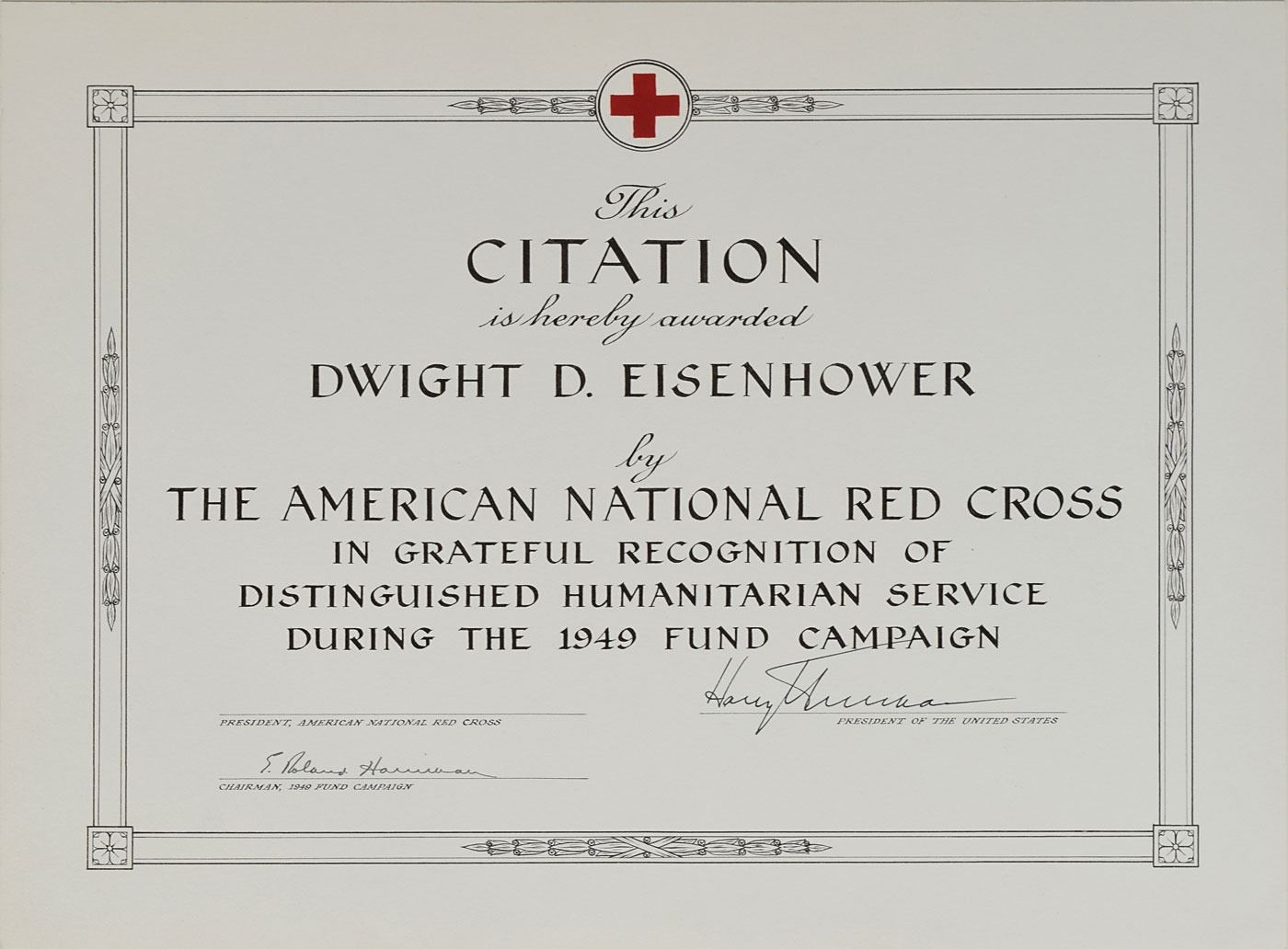 Unique DS as president, signed “Harry S. Truman,” one page, 14 x 11, no date but circa 1949. A calligraphically inscribed certificate, in full: "This Citation is hereby awarded, Dwight D. Eisenhower, by the American National Red Cross, in grateful recognition of distinguished humanitarian service during the 1949 fund campaign." Signed at the conclusion by President Truman and countersigned by E. Roland Harriman as chairman of the campaign; the area for the signature of the president of the American National Red Cross is blank. In very fine condition. The 1949 American Red Cross fund campaign commenced on February 28th, kicking off with a special television program emceed by James Stewart which featured addresses by President Truman and General Eisenhower, and a dramatic sketch performed by Helen Hayes. An outstanding association piece.