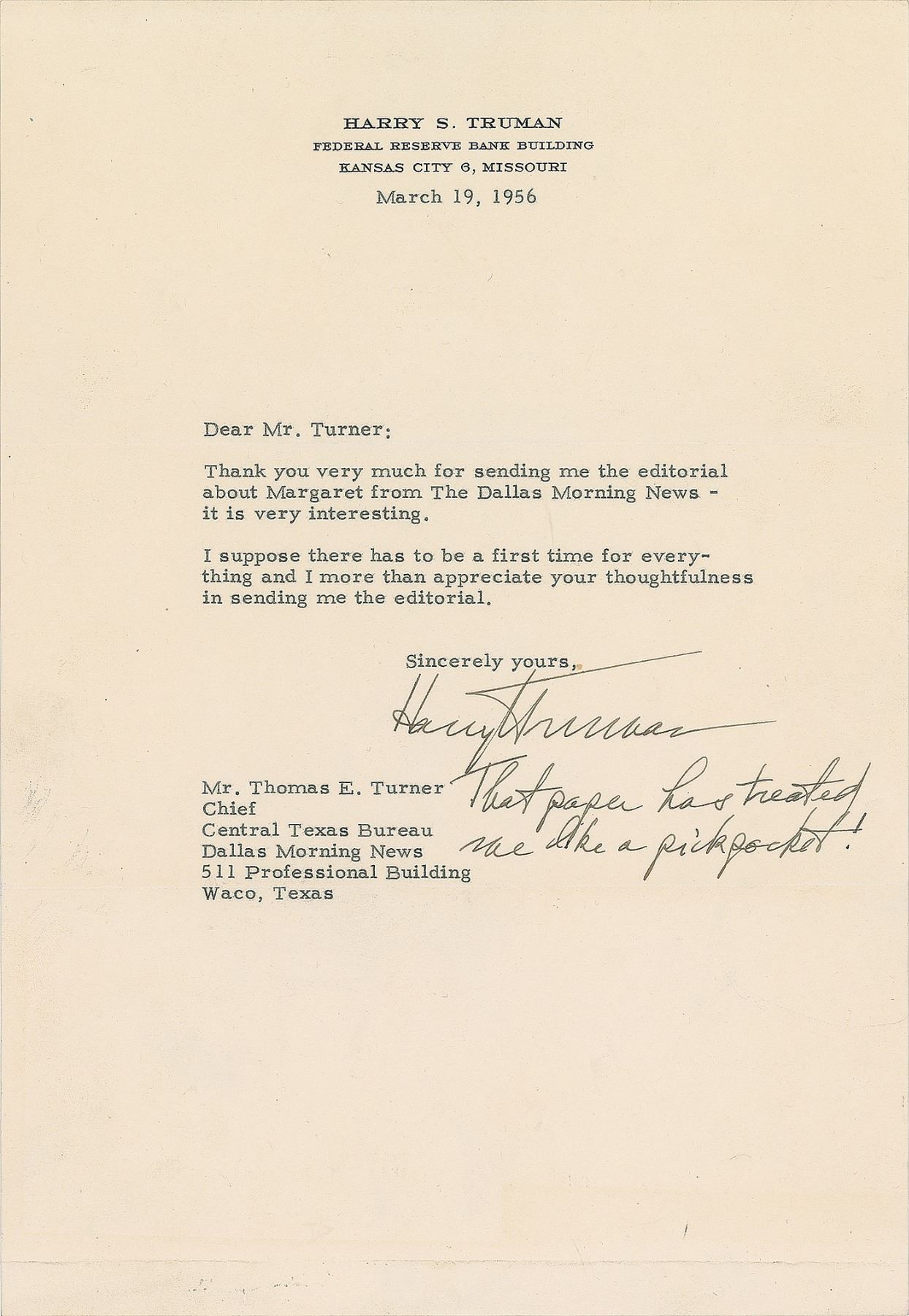 TLS, one page, 7.25 x 10.5, personal letterhead, March 19, 1956. Letter to Thomas E. Turner of the Central Texas Bureau, in full: "Thank you very much for sending me the editorial about Margaret from The Dallas Morning News—it is very interesting. I suppose there has to be a first time for everything and I more than appreciate your thoughtfulness in sending me the editorial." Truman adds a closing line in his own hand, "That paper has treated me like a pickpocket!" In fine condition, with an extra horizontal fold near the bottom edge. Accompanied by the original mailing envelope.