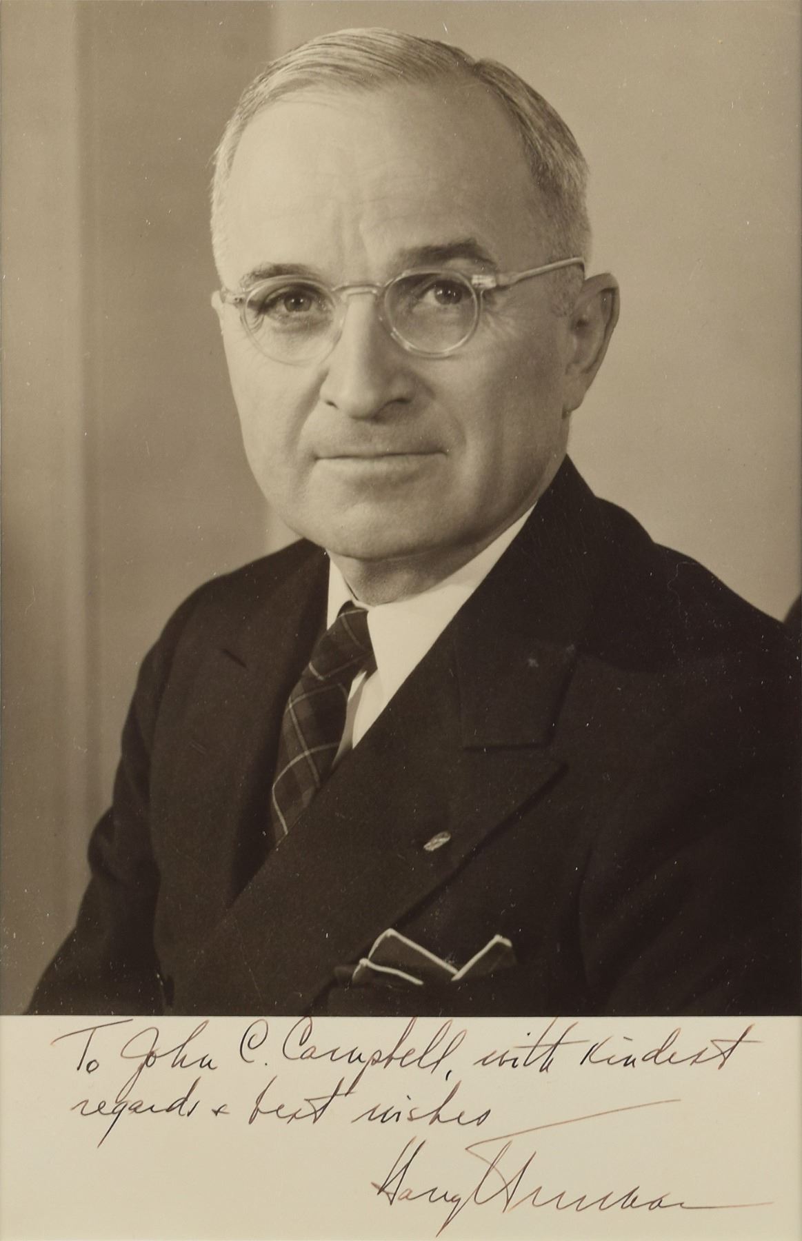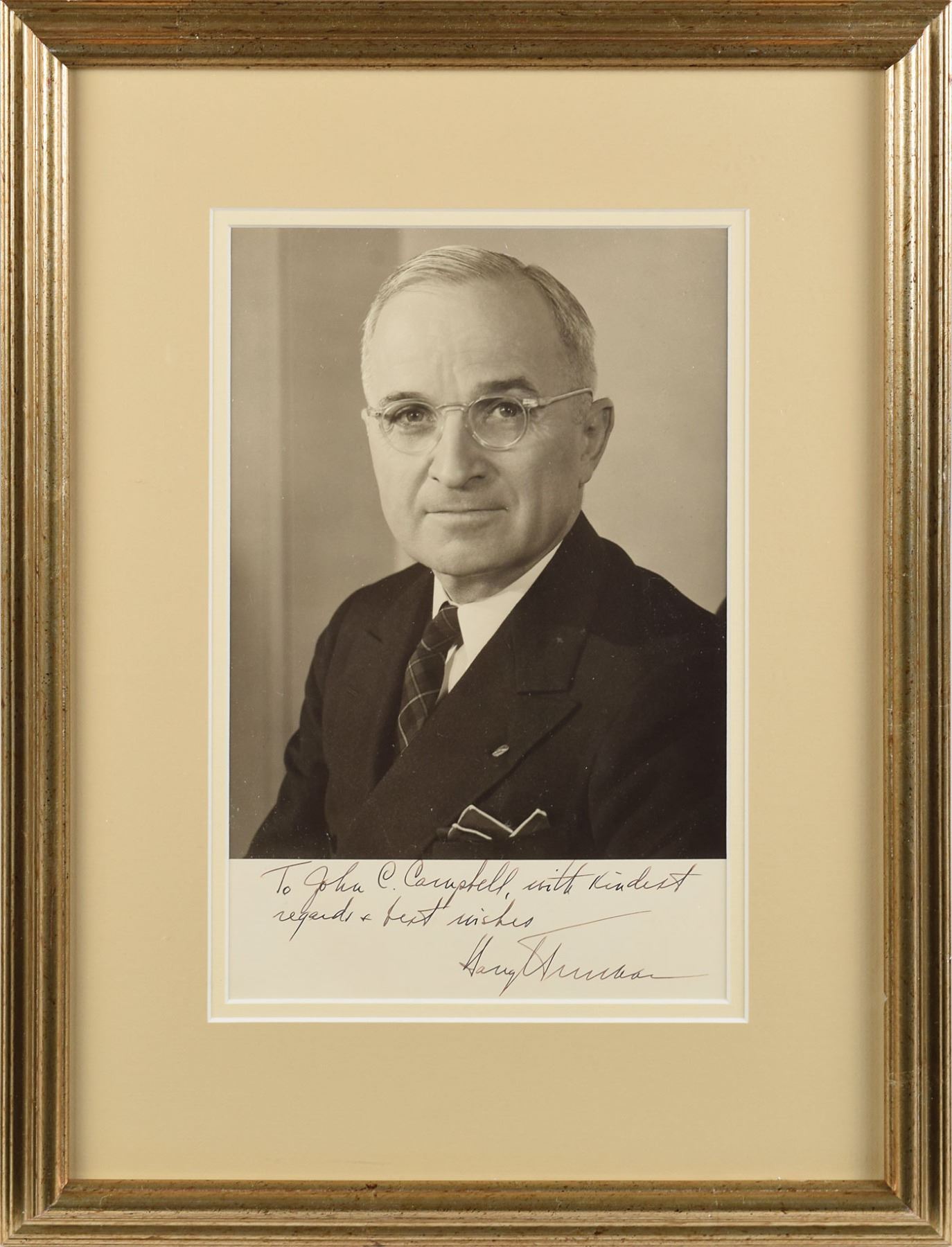 Handsome matte-finish 7.25 x 11.25 head-and-shoulders photo of President Truman, signed and inscribed in the lower border in fountain pen, "To John C. Campbell, with kindest regards & best wishes, Harry S. Truman.” Nicely double-matted and framed to an overall size of 13.75 x 18. In fine condition, with a somewhat noticeable crease to the lower left. John C. Campbell served in the State Department as a specialist on Eastern Europe from 1942 to 1946, and as an advisor in various roles thereafter.