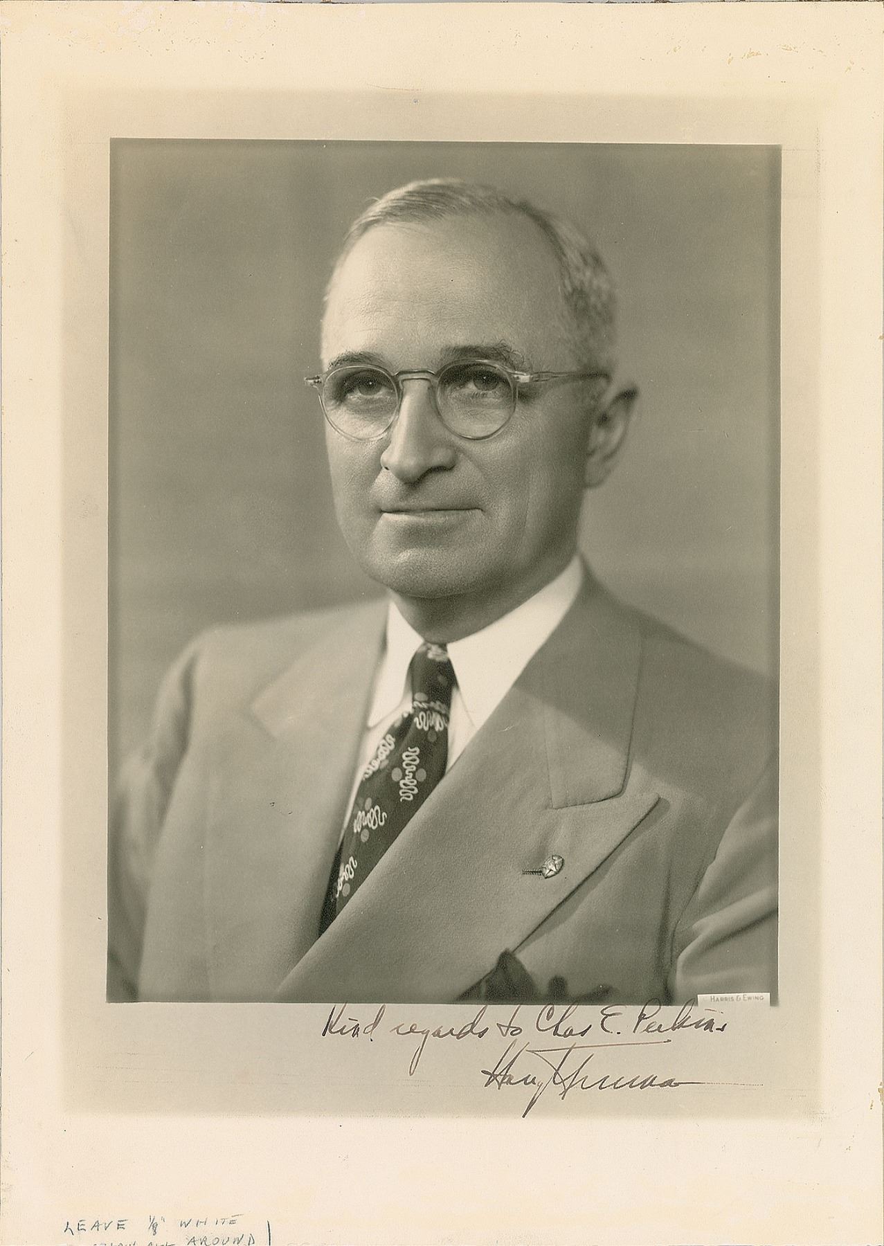Impressive matte-finish 9.5 x 13.25 Harris & Ewing portrait of Truman, signed and inscribed in the lower border in fountain pen, "Kind regards to Chas. E. Perkins, Harry S. Truman.” Affixed to a same-size mount. In fine condition, with trimming to the mount.