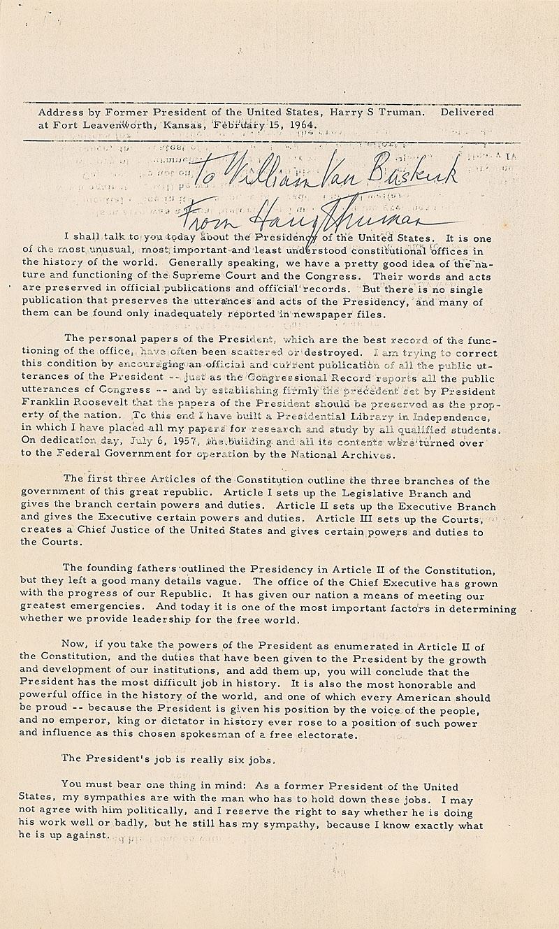 Mimeographed speech, five pages, 8.5 x 14, originally given by Truman at Fort Leavenworth, Kansas, on February 15, 1964. Speech deals with the power of the president and the fact that there were no official records being maintained of all of the presidents' papers and acts, which he believes need to be maintained to get a full understanding of the presidency's workings. Signed and inscribed on the first page in black ballpoint, "To William Van Buskirk from Harry S. Truman." In fine condition.