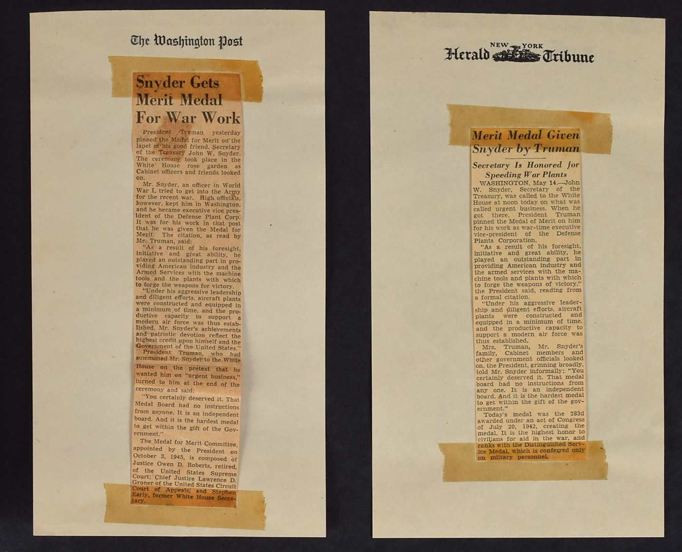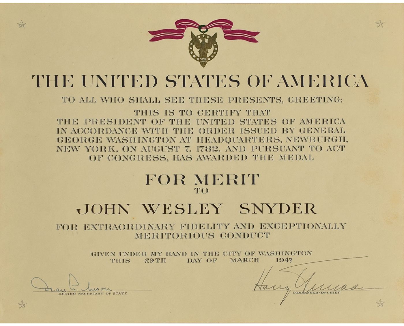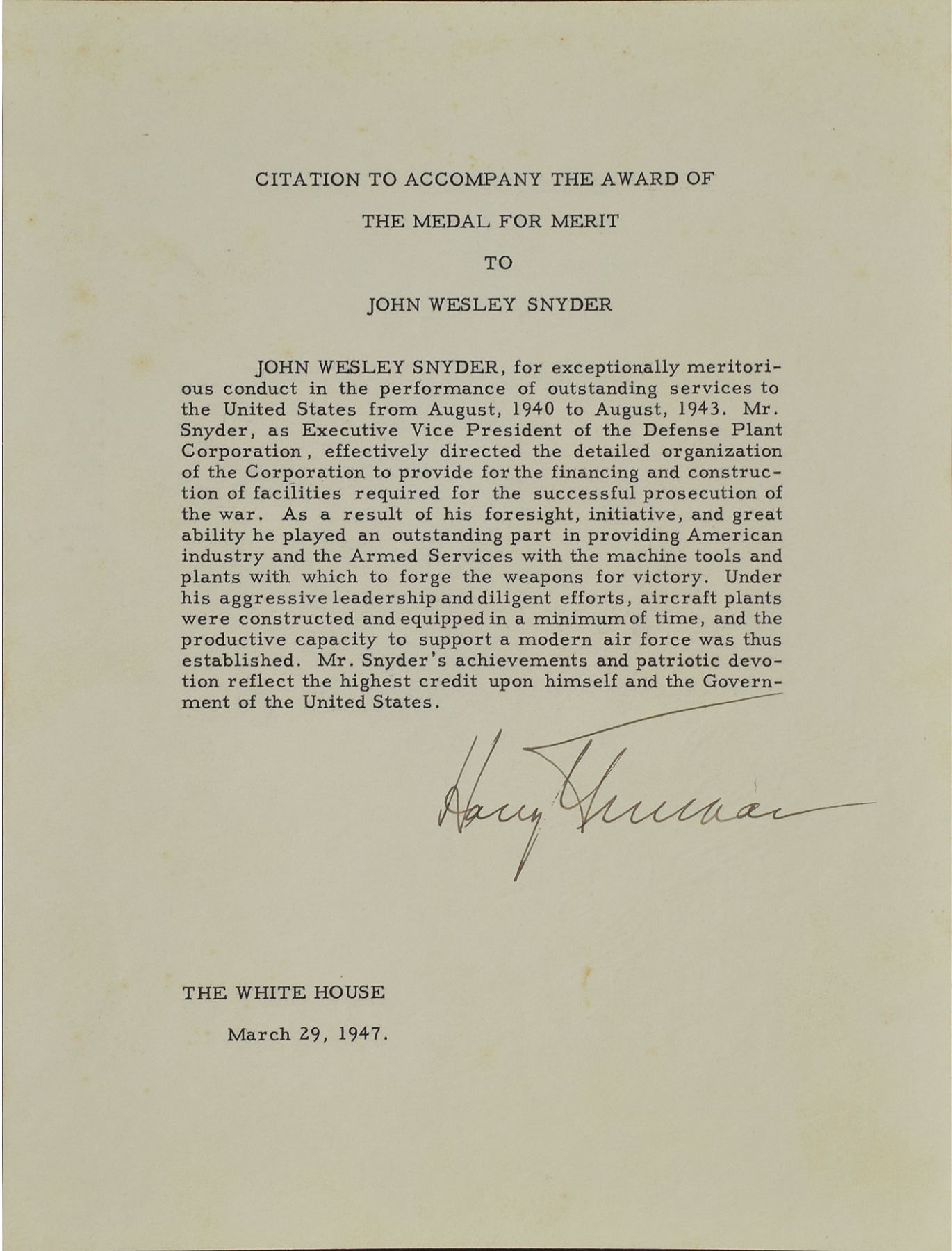 Historic custom-made green Morocco leather scrapbook, 14 x 11, imprinted on the front cover, "The Medal for Merit, John W. Snyder," containing two documents signed by Truman: a DS as president, one page, 12 x 9.75, March 29, 1947, in part: "The President of the United States of America in accordance with the Order issued by General George Washington at Headquarters, Newburgh, New York, on August 7, 1782, and pursuant to Act of Congress, has awarded the Medal for Merit to John Wesley Snyder for extraordinary fidelity and exceptionally meritorious conduct," signed at the conclusion by President Truman and Acting Secretary of State Dean Acheson; and a DS as president, one page, 8 x 10, March 29, 1947, headed, "Citation to Accompany the Award of the Medal for Merit to John Wesley Snyder," in full: "John Wesley Snyder, for exceptionally meritorious conduct in the performance of outstanding services to the United States from August, 1940 to August, 1943. Mr. Snyder, as Executive Vice President of the Defense Plant Corporation, effectively directed the detailed organization of the Corporation to provide for the financing and construction of facilities required for the successful prosecution of the war. As a result of his foresight, initiative, and great ability he played an outstanding part in providing American industry and the Armed Services with the machine tools and plants with which to forge the weapons for victory. Under his aggressive leadership and diligent efforts, aircraft plants were constructed and equipped in a minimum of time, and the productive capacity to support a modern air force was thus established. Mr. Snyder's achievements and patriotic devotion reflect the highest credit upon himself and the Government of the United States." Also affixed inside the scrapbook are an image of the Medal for Merit, an original Acme Newspictures photo of President Truman presenting the medal to Snyder, newspaper clippings concerning the award, and a typescript of a list of recipients of the award, as well as a laid in copy of the list published in the Congressional Record. In overall fine condition, with light wear to the leather covers. As head of the Defense Plant Corporation, Snyder directed the financing of the facilities at Oak Ridge for the construction of the atomic bombs dropped on Hiroshima and Nagasaki, which effectively ended World War II.