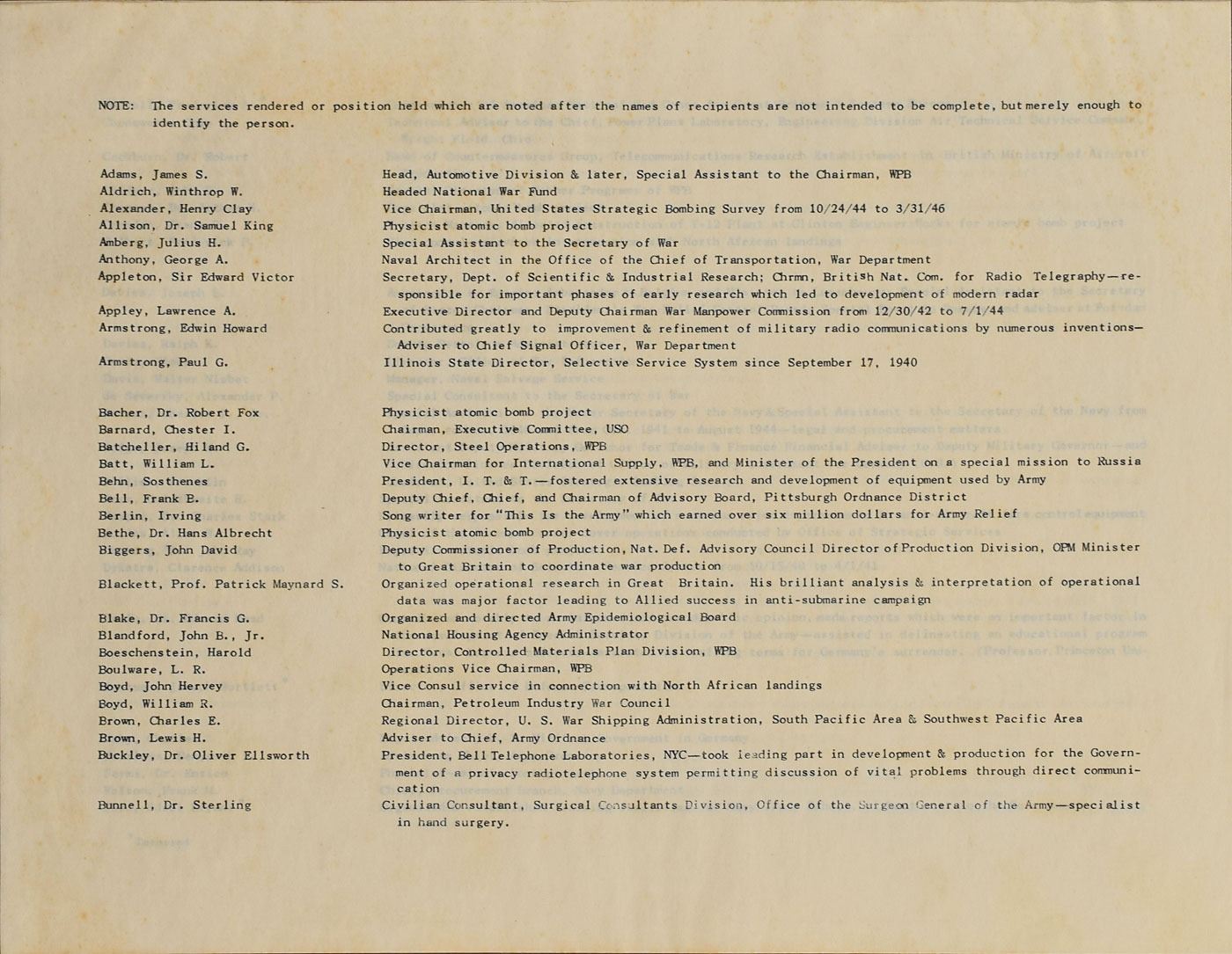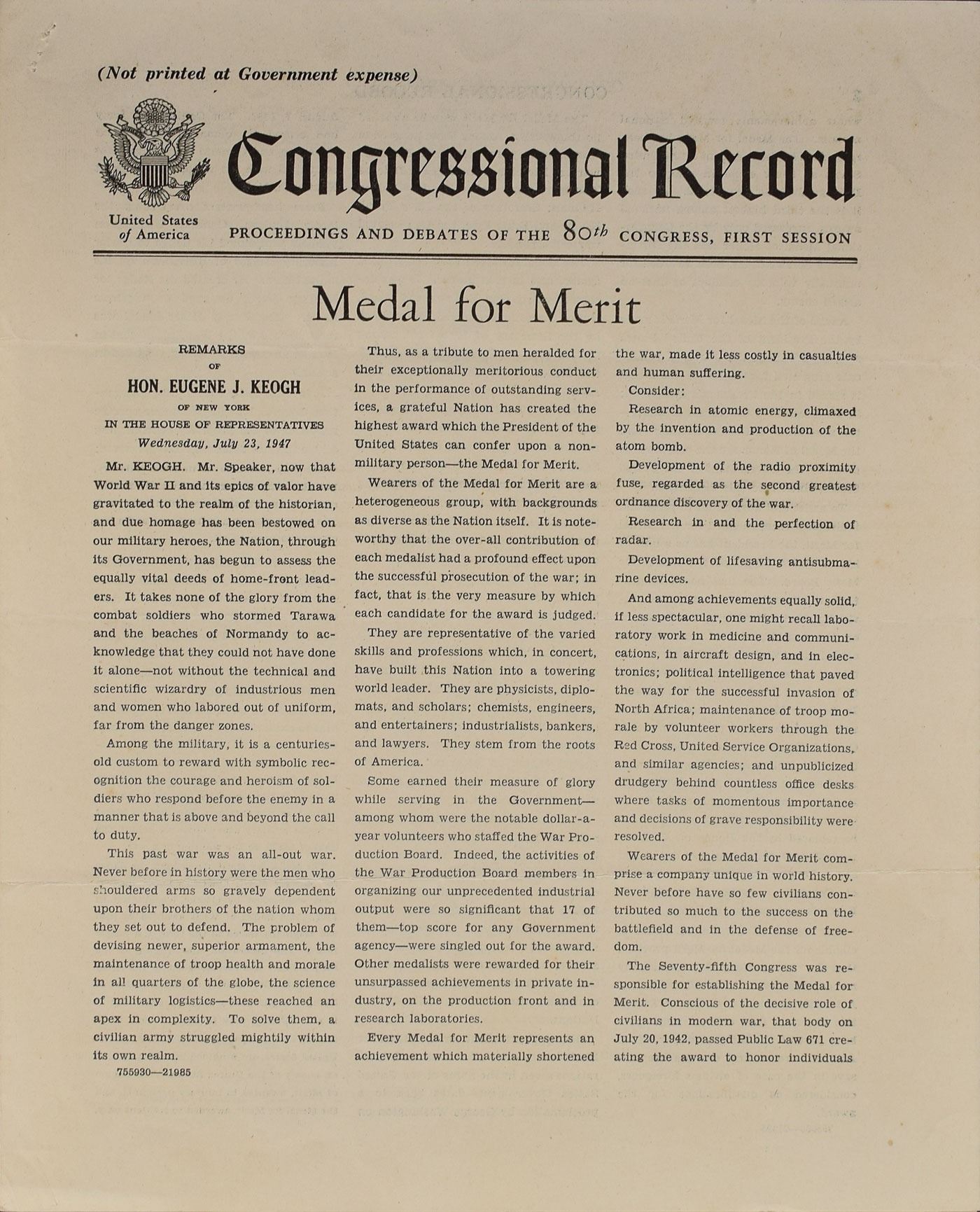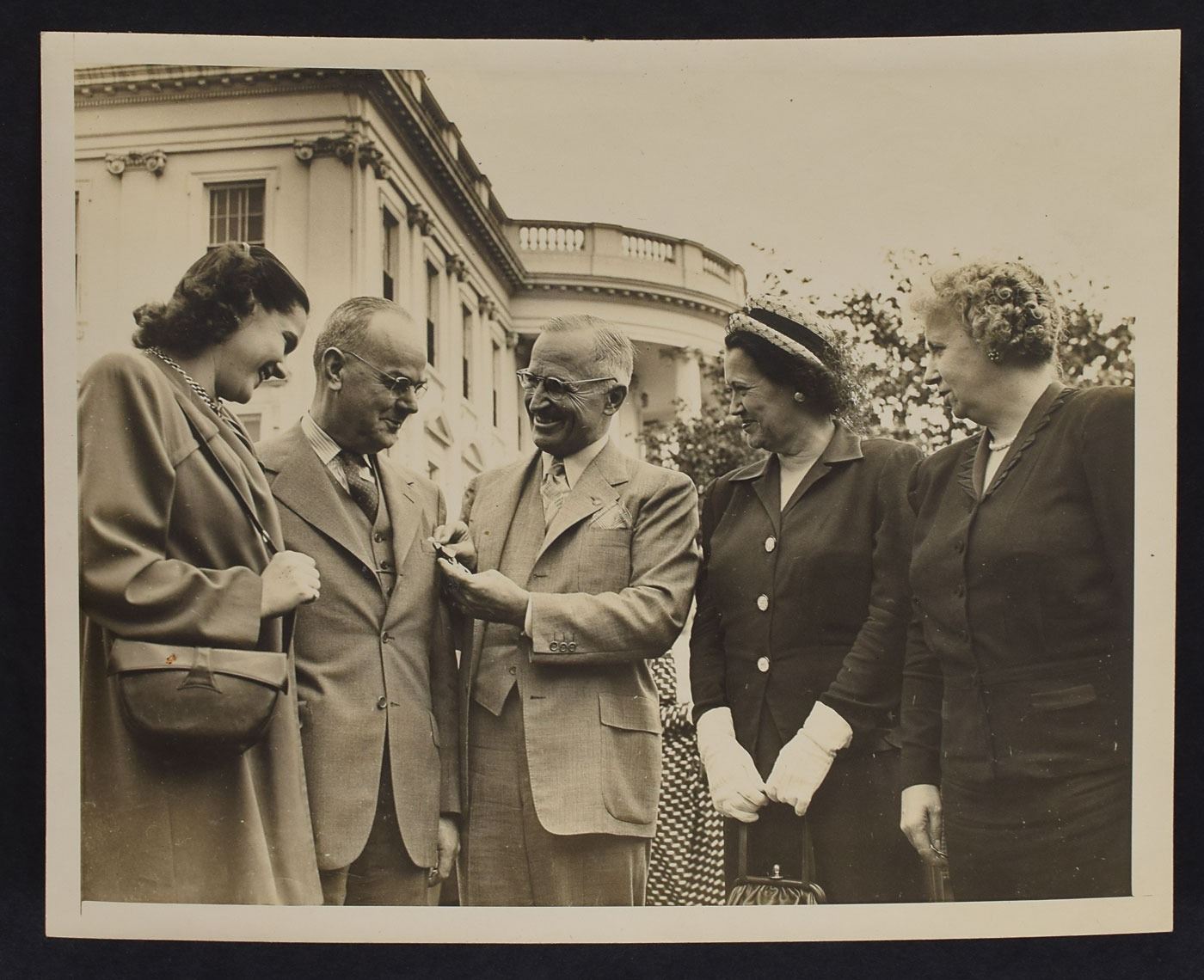 Historic custom-made green Morocco leather scrapbook, 14 x 11, imprinted on the front cover, "The Medal for Merit, John W. Snyder," containing two documents signed by Truman: a DS as president, one page, 12 x 9.75, March 29, 1947, in part: "The President of the United States of America in accordance with the Order issued by General George Washington at Headquarters, Newburgh, New York, on August 7, 1782, and pursuant to Act of Congress, has awarded the Medal for Merit to John Wesley Snyder for extraordinary fidelity and exceptionally meritorious conduct," signed at the conclusion by President Truman and Acting Secretary of State Dean Acheson; and a DS as president, one page, 8 x 10, March 29, 1947, headed, "Citation to Accompany the Award of the Medal for Merit to John Wesley Snyder," in full: "John Wesley Snyder, for exceptionally meritorious conduct in the performance of outstanding services to the United States from August, 1940 to August, 1943. Mr. Snyder, as Executive Vice President of the Defense Plant Corporation, effectively directed the detailed organization of the Corporation to provide for the financing and construction of facilities required for the successful prosecution of the war. As a result of his foresight, initiative, and great ability he played an outstanding part in providing American industry and the Armed Services with the machine tools and plants with which to forge the weapons for victory. Under his aggressive leadership and diligent efforts, aircraft plants were constructed and equipped in a minimum of time, and the productive capacity to support a modern air force was thus established. Mr. Snyder's achievements and patriotic devotion reflect the highest credit upon himself and the Government of the United States." Also affixed inside the scrapbook are an image of the Medal for Merit, an original Acme Newspictures photo of President Truman presenting the medal to Snyder, newspaper clippings concerning the award, and a typescript of a list of recipients of the award, as well as a laid in copy of the list published in the Congressional Record. In overall fine condition, with light wear to the leather covers. As head of the Defense Plant Corporation, Snyder directed the financing of the facilities at Oak Ridge for the construction of the atomic bombs dropped on Hiroshima and Nagasaki, which effectively ended World War II.